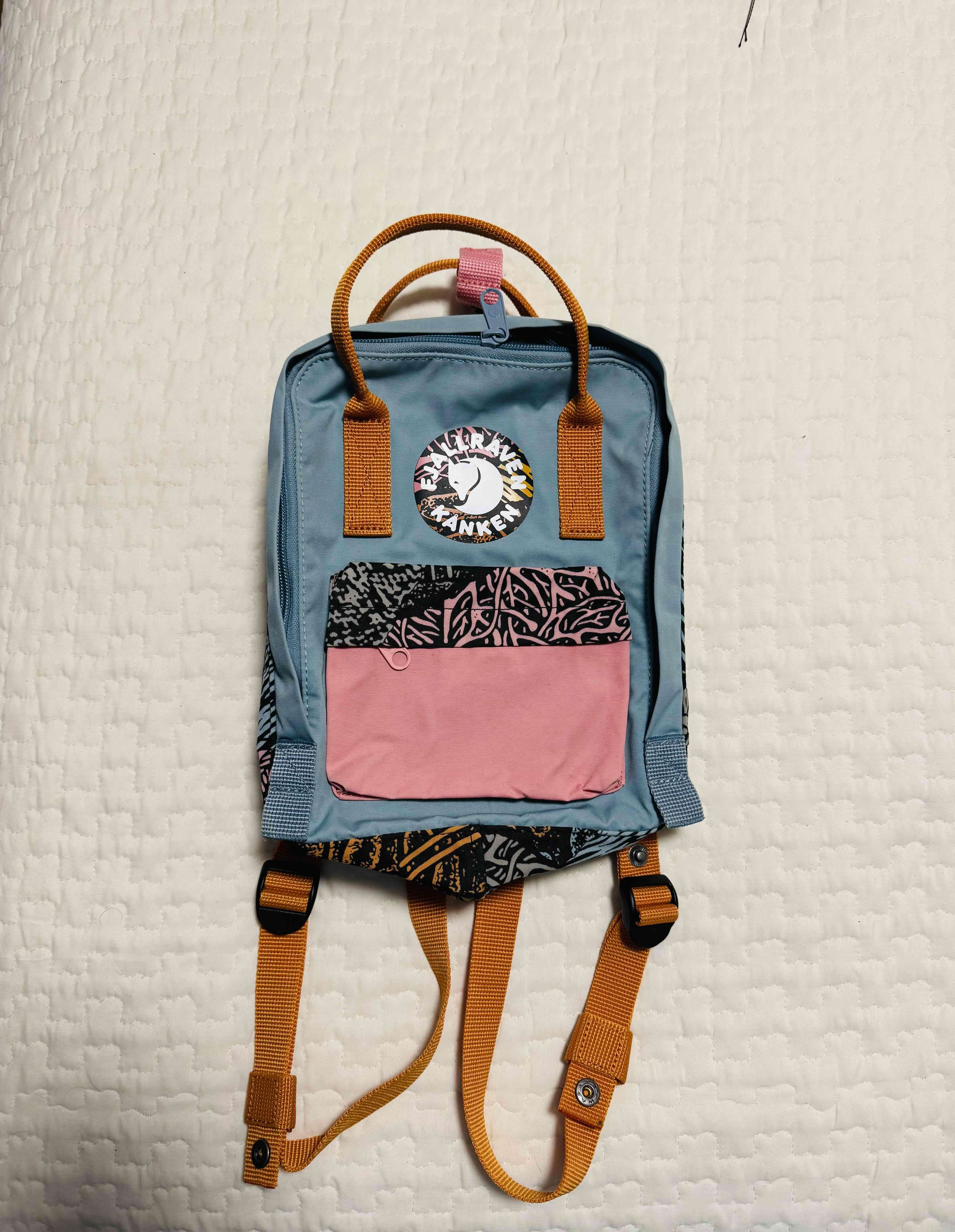 Mochila con diseño moderno y colorido, perfecta para uso diario. En buen estado, con leves signos de uso.