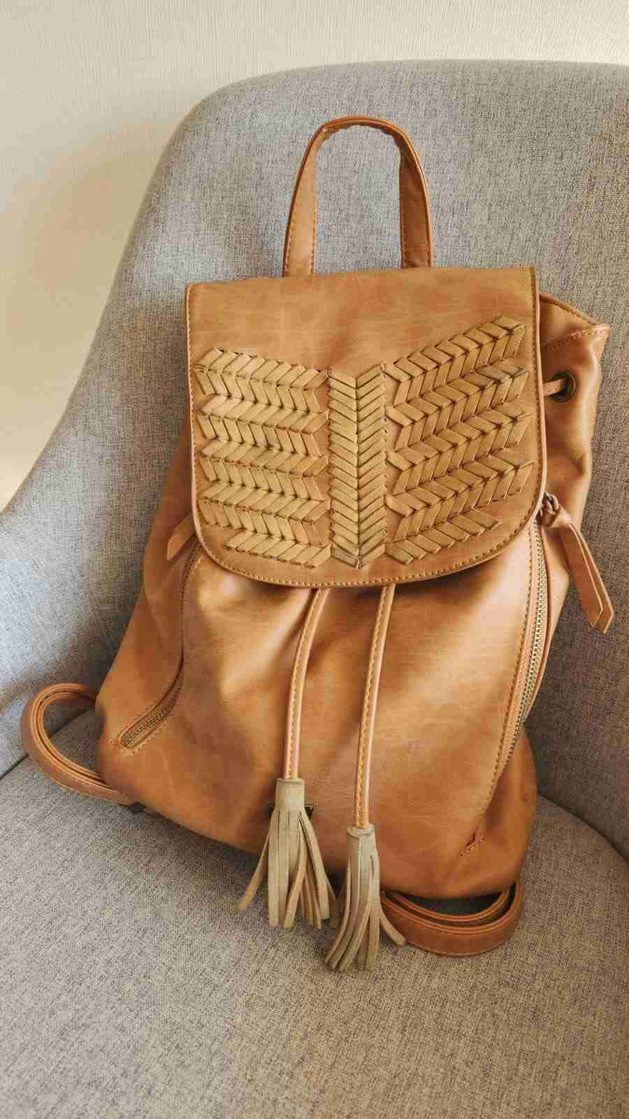 Mochila de estilo casual en color tipo cuero con detalles trenzados. Perfecta para uso diario. En buen estado.