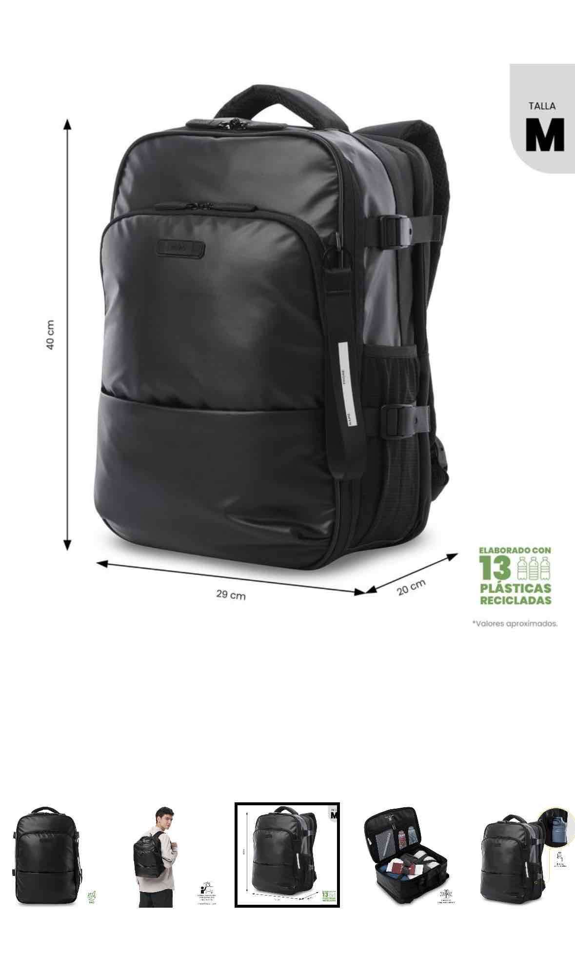 Mochila de color negro fabricada con 13 plásticos reciclados. Ideal para uso diario y oficina. Diseño funcional y ecológico.