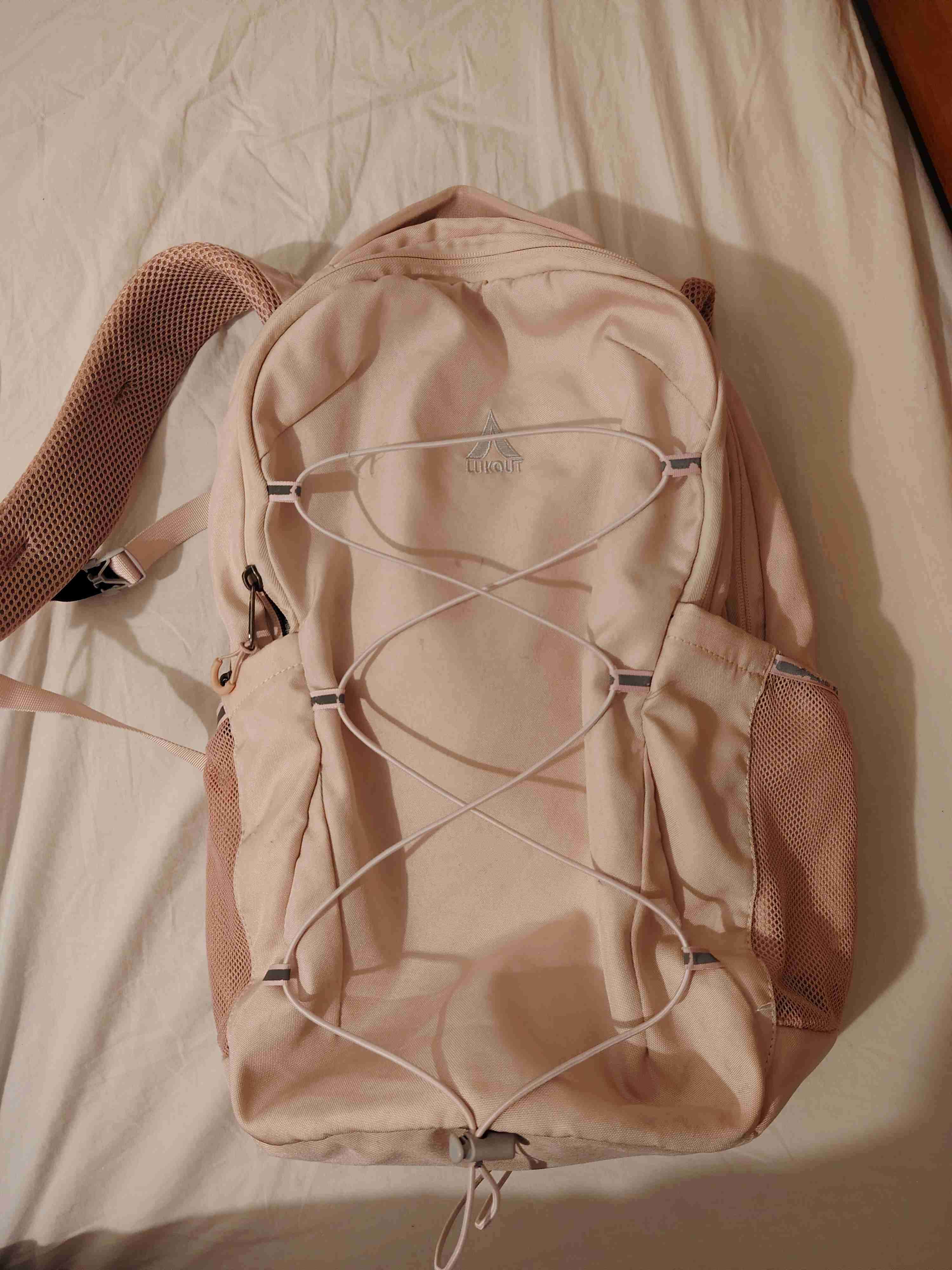Mochila en color rosada claro ideal para uso diario o viajes, sirve como maleta de ambo en avión. En buen estado con mínimos signos de uso.