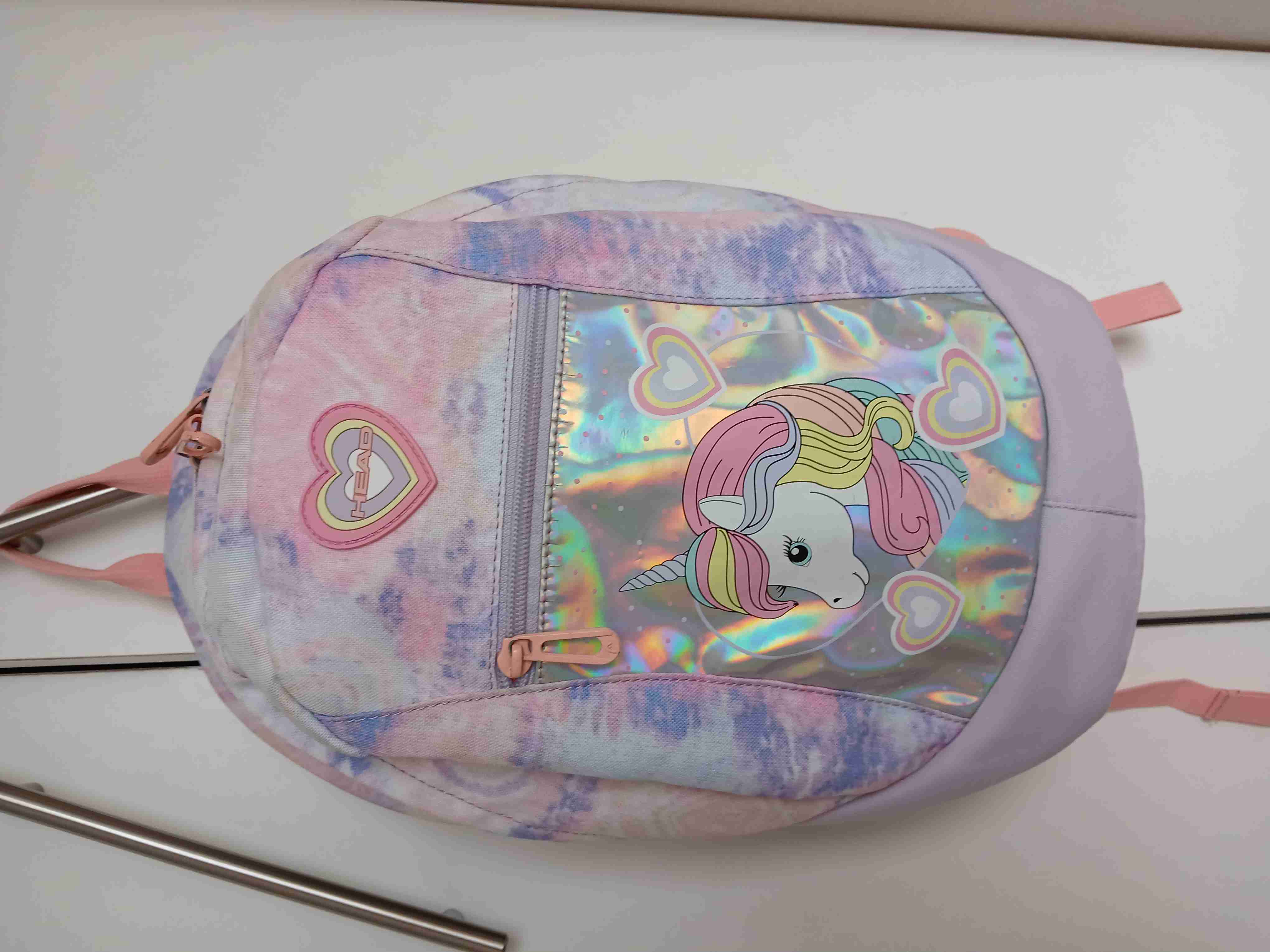 Mochila infantil con diseño de unicornio en tonos pastel. Ideal para el colegio o salidas. Buen estado. Marca Head