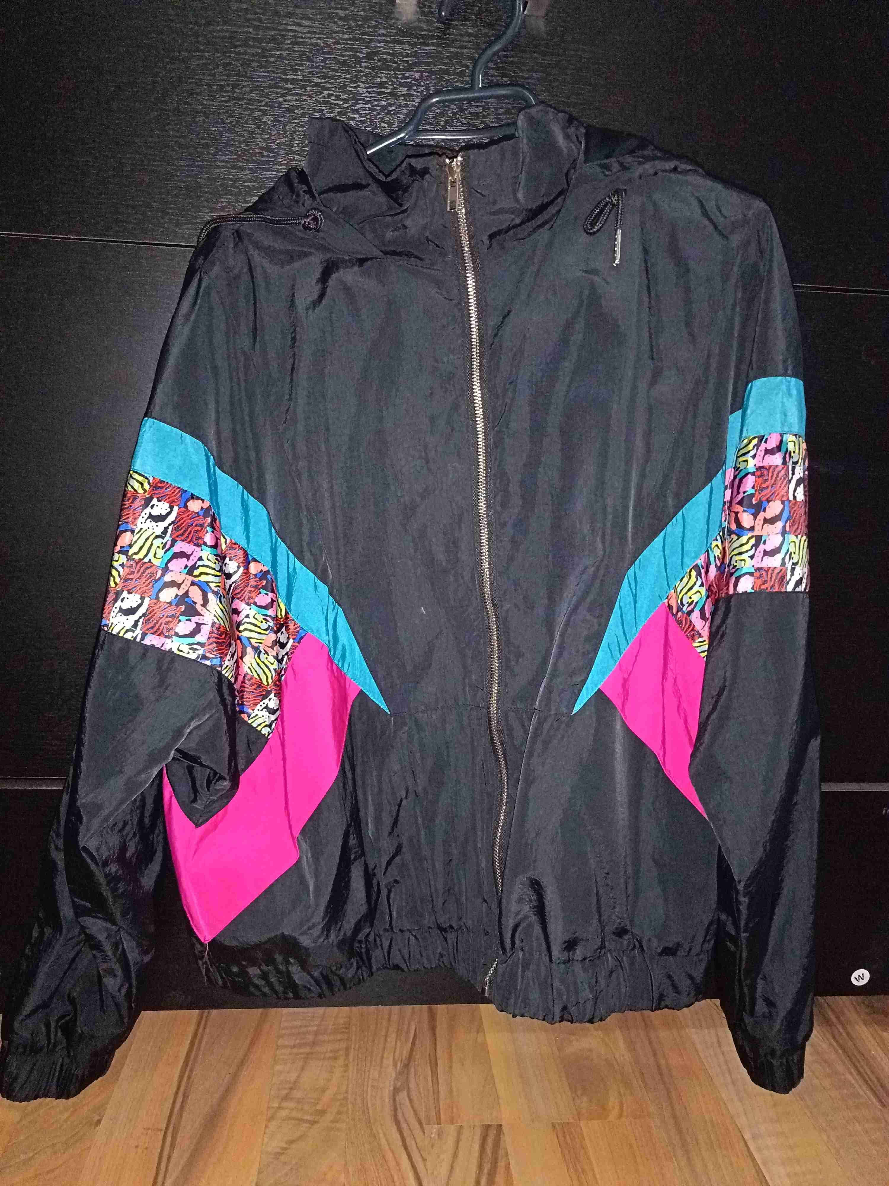 Chaqueta cortaviento de estilo retro con colores llamativos. Ideal para uso casual en días frescos. En buen estado general.