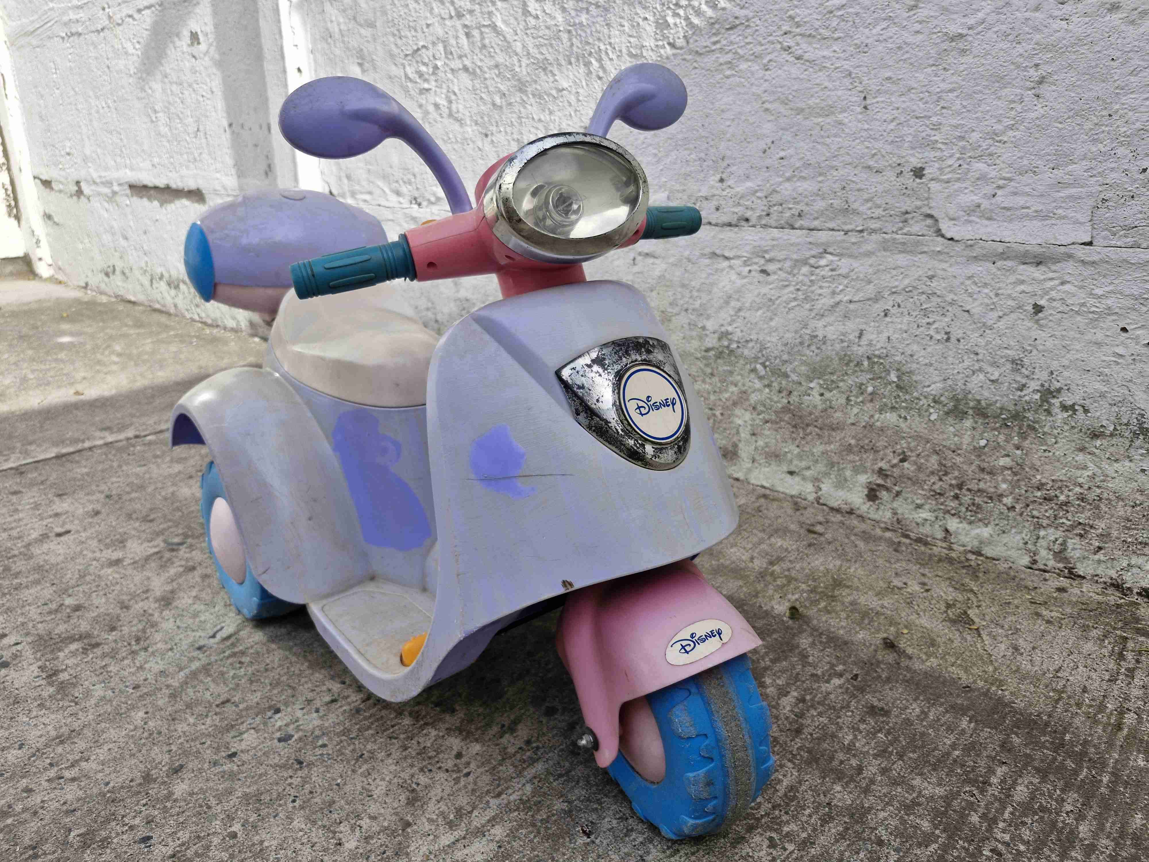 Moto eléctrica infantil Disney en colores pastel. Ideal para juegos al aire libre. Uso visible pero funcional. Incluye cargador. La batería carga pero dura poco, por el uso. Botonera de luces y sonido funciona intermitentemente. Medidad 80cms de largo aprox y 60cms de alto aprox.