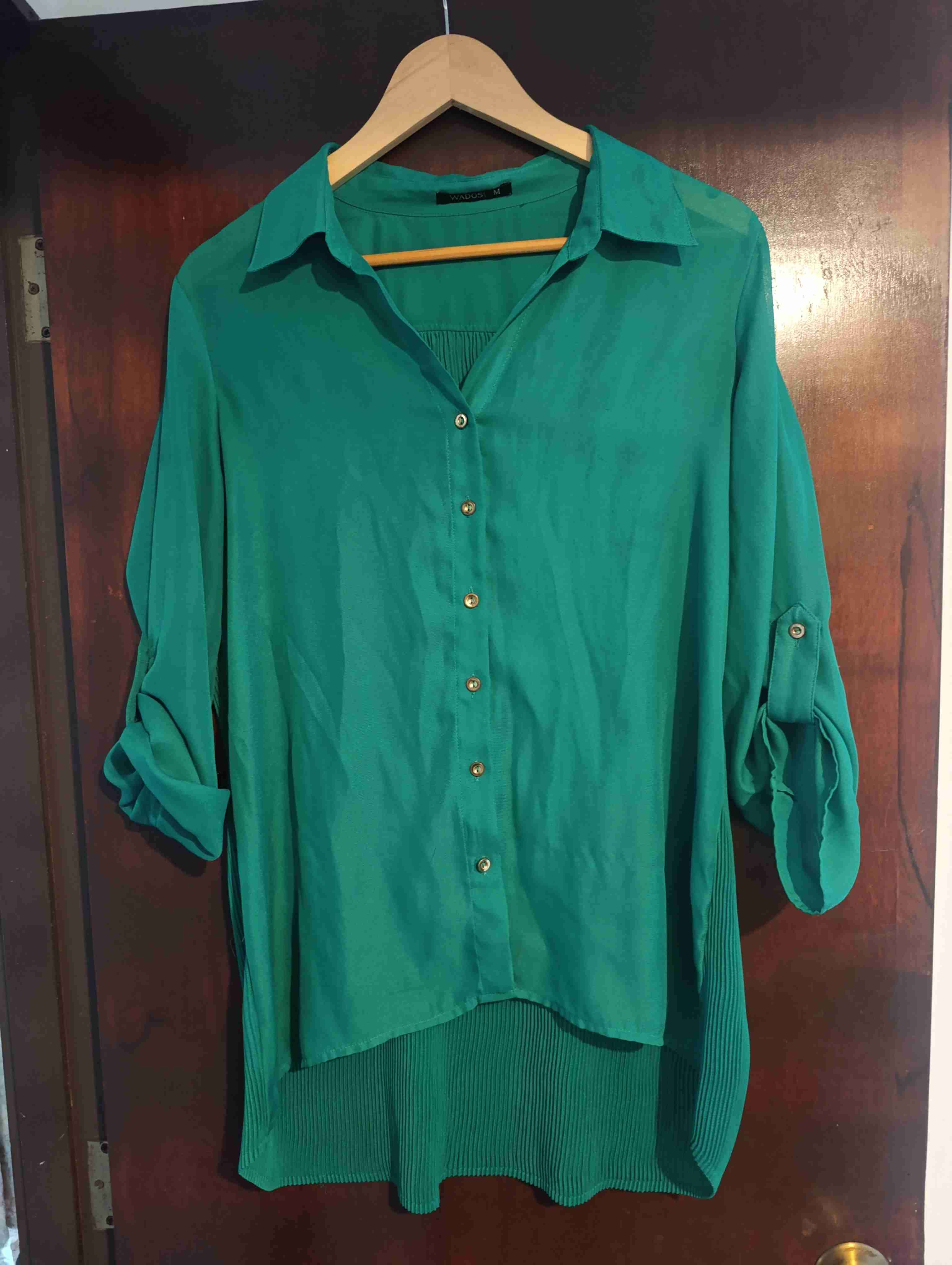 Blusa de color verde con botones dorados, perfecta para un look casual o formal. En buen estado general.