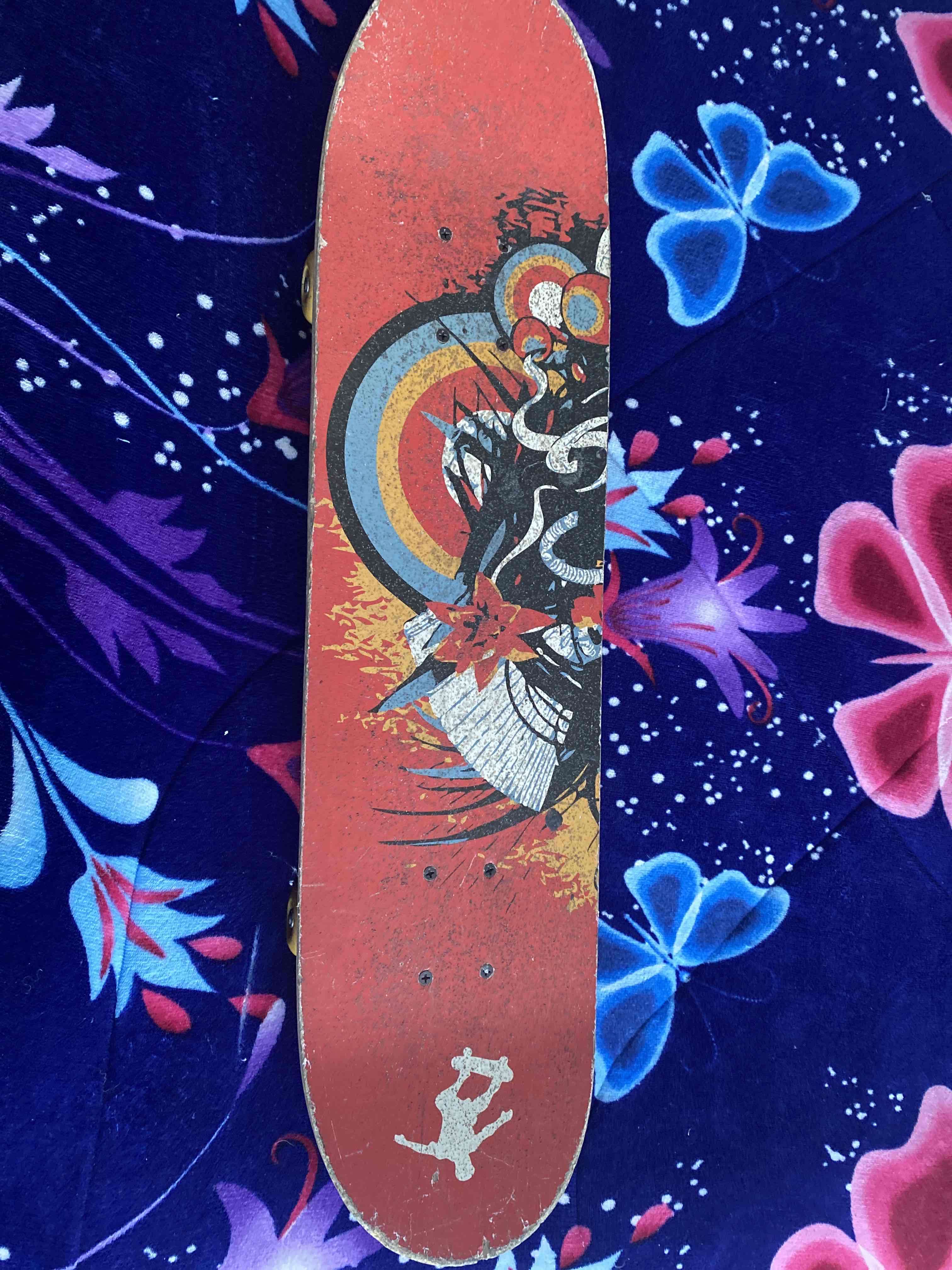 Patineta con diseño llamativo, ideal para trucos y paseos. En buen estado con signos de uso.