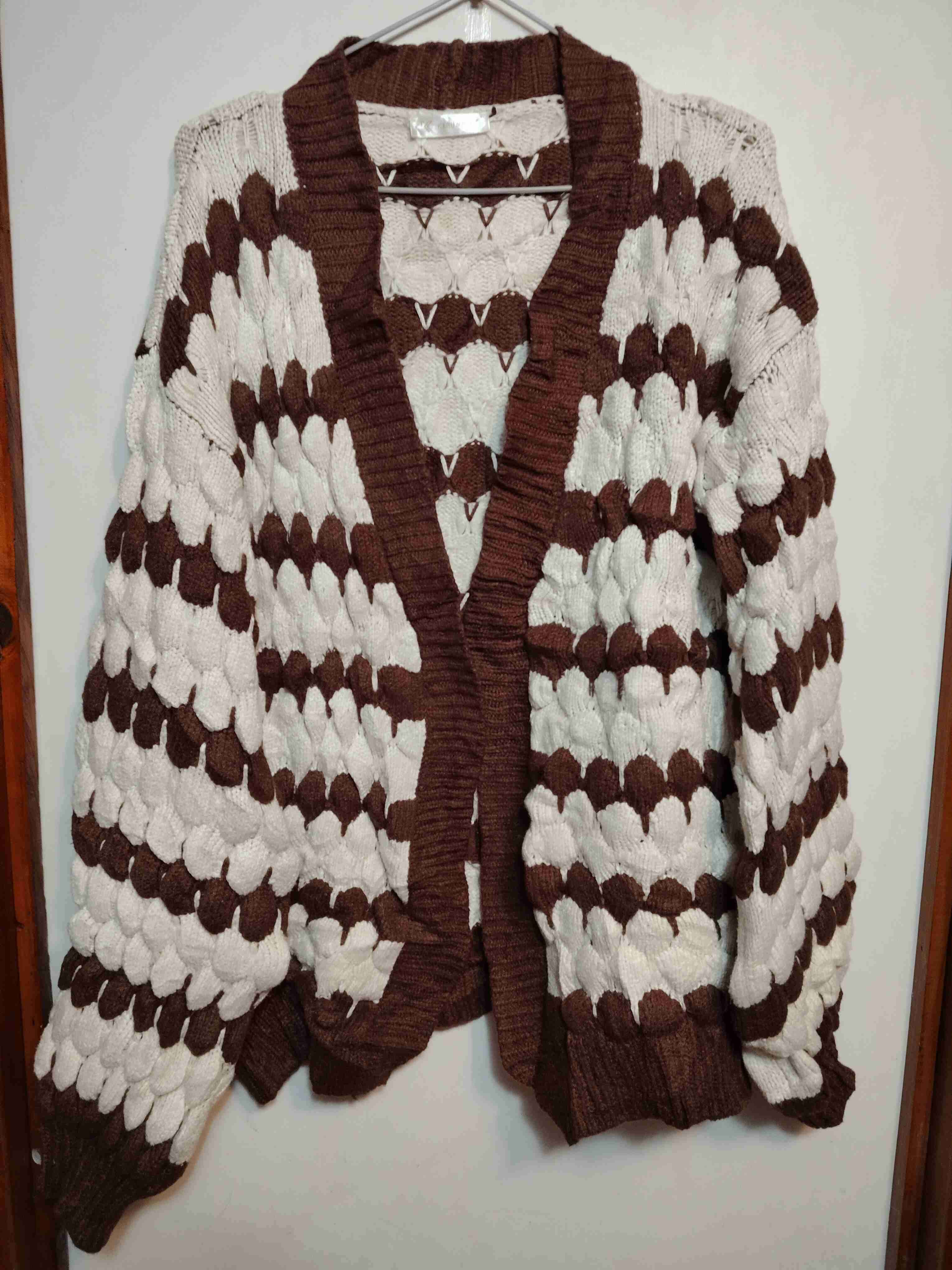 Cardigan tejido en tonos blanco y café, perfecto para el invierno. Se ve en buen estado general, ideal para un look casual.