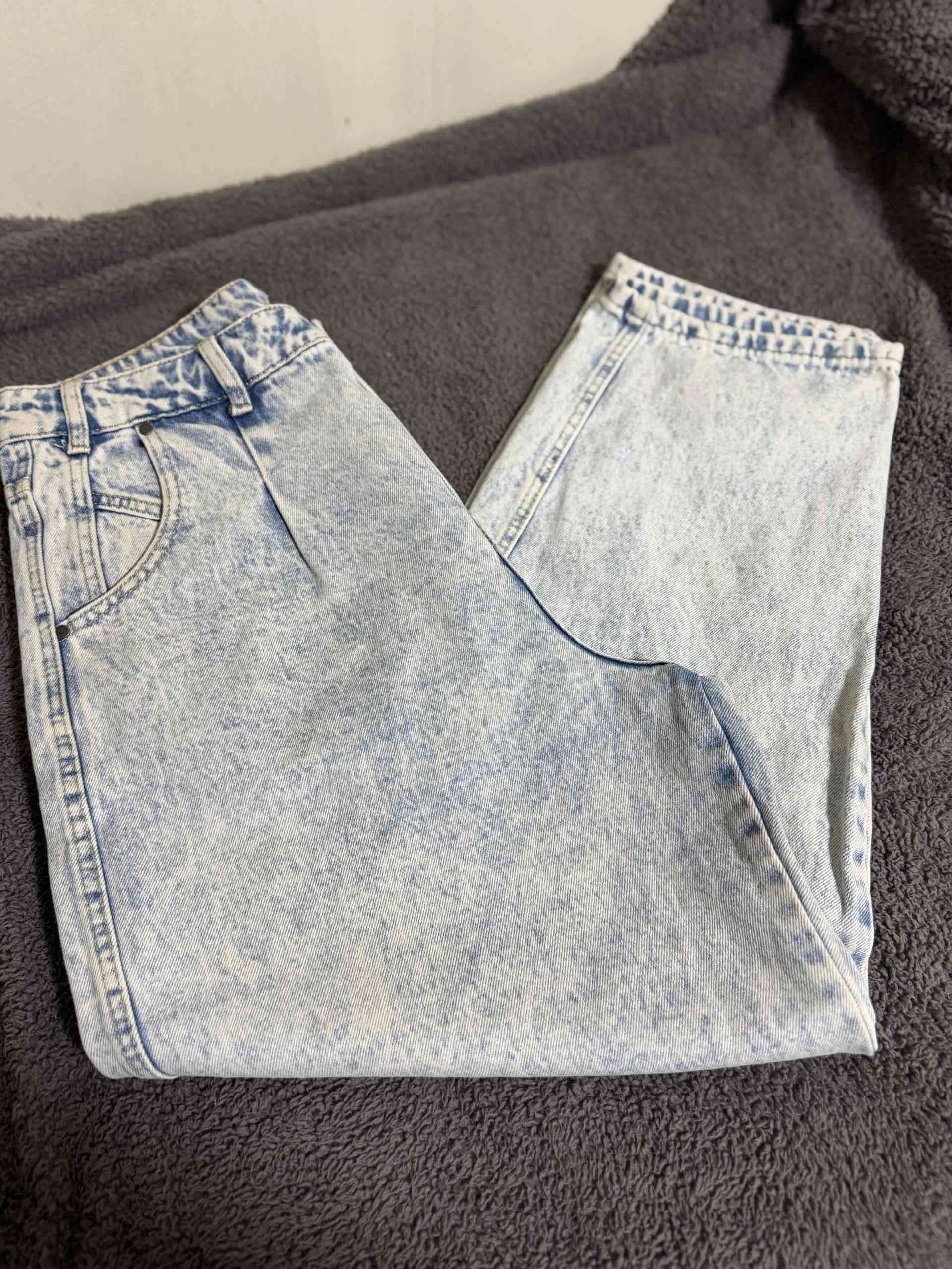 Jeans estilo acid wash en color celeste claro, perfecto para un look casual. En buen estado con pequeños signos de uso.