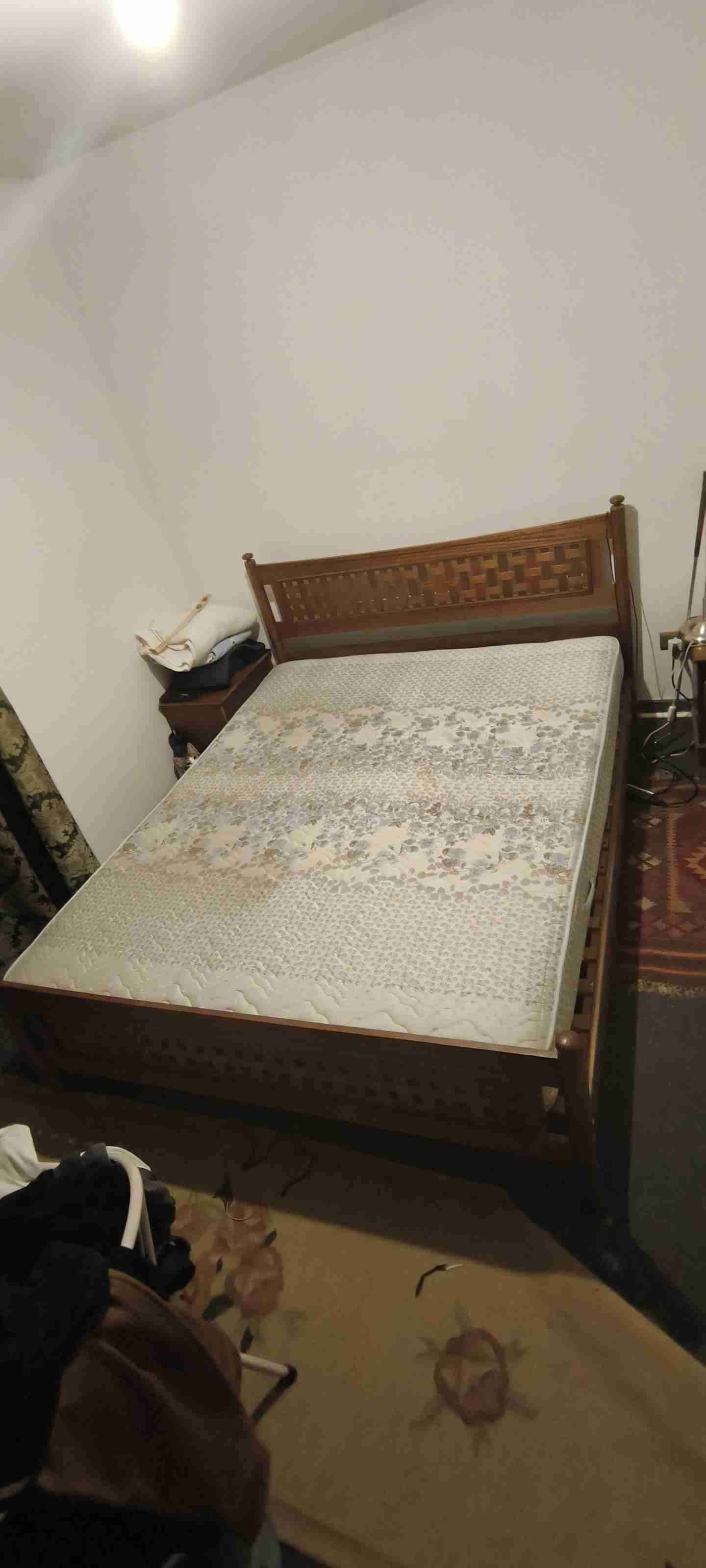Cama matrimonial en madera robusta, incluye colchón. Ideal para dormitorio principal, buen estado general. Incluye los dos veladores
