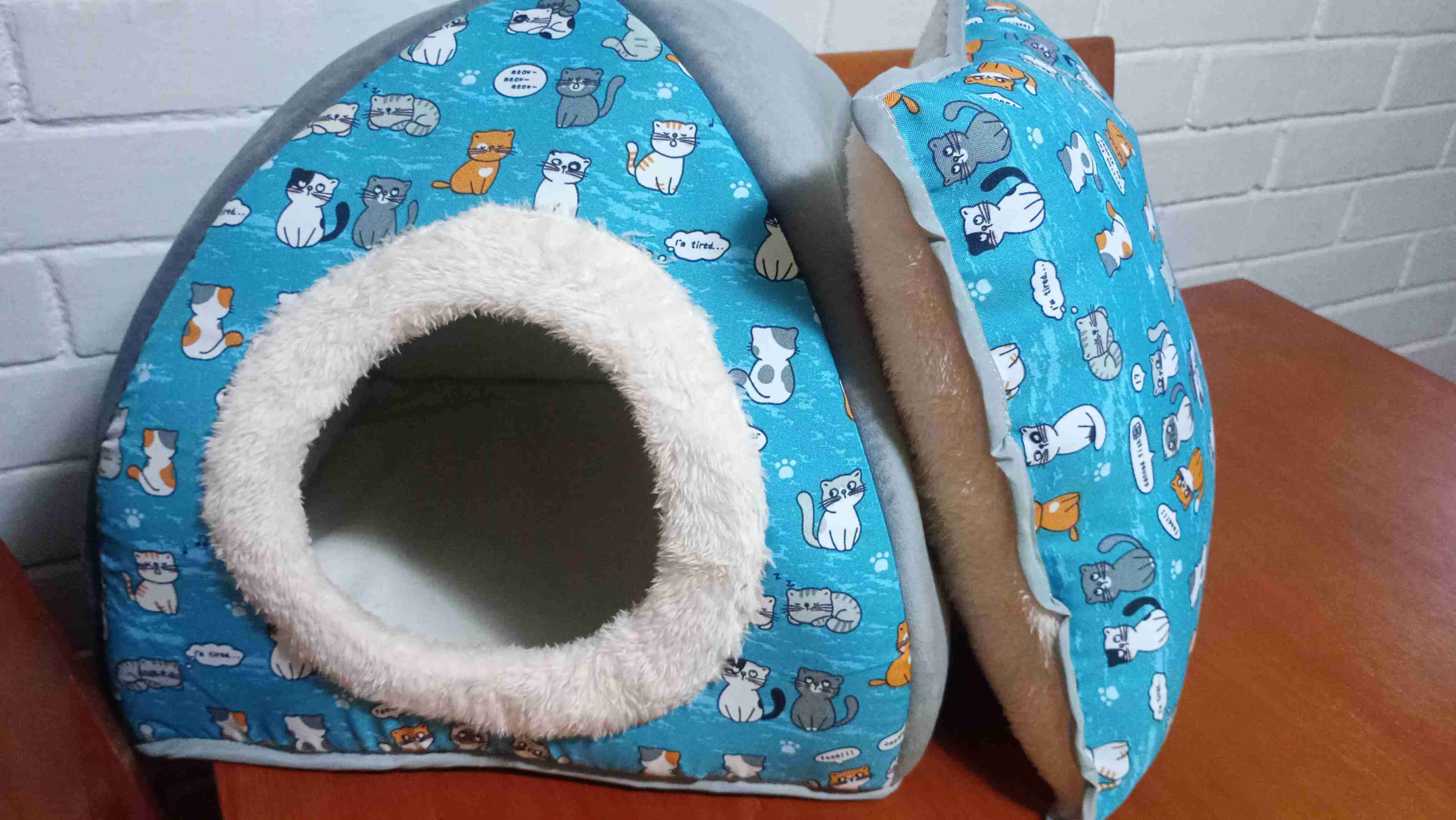 Cómoda y acogedora casa para gatos con diseño animado. Perfecta para el descanso de tu mascota. En buen estado.