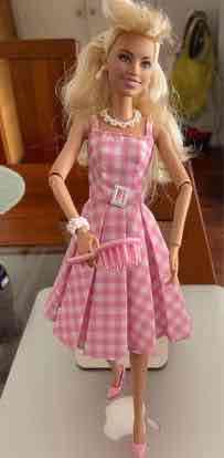 Muñeca barbie la película con accesorios con vestido a cuadros rosado, ideal para colección. En buen estado, perfecta para jugar o exhibir.