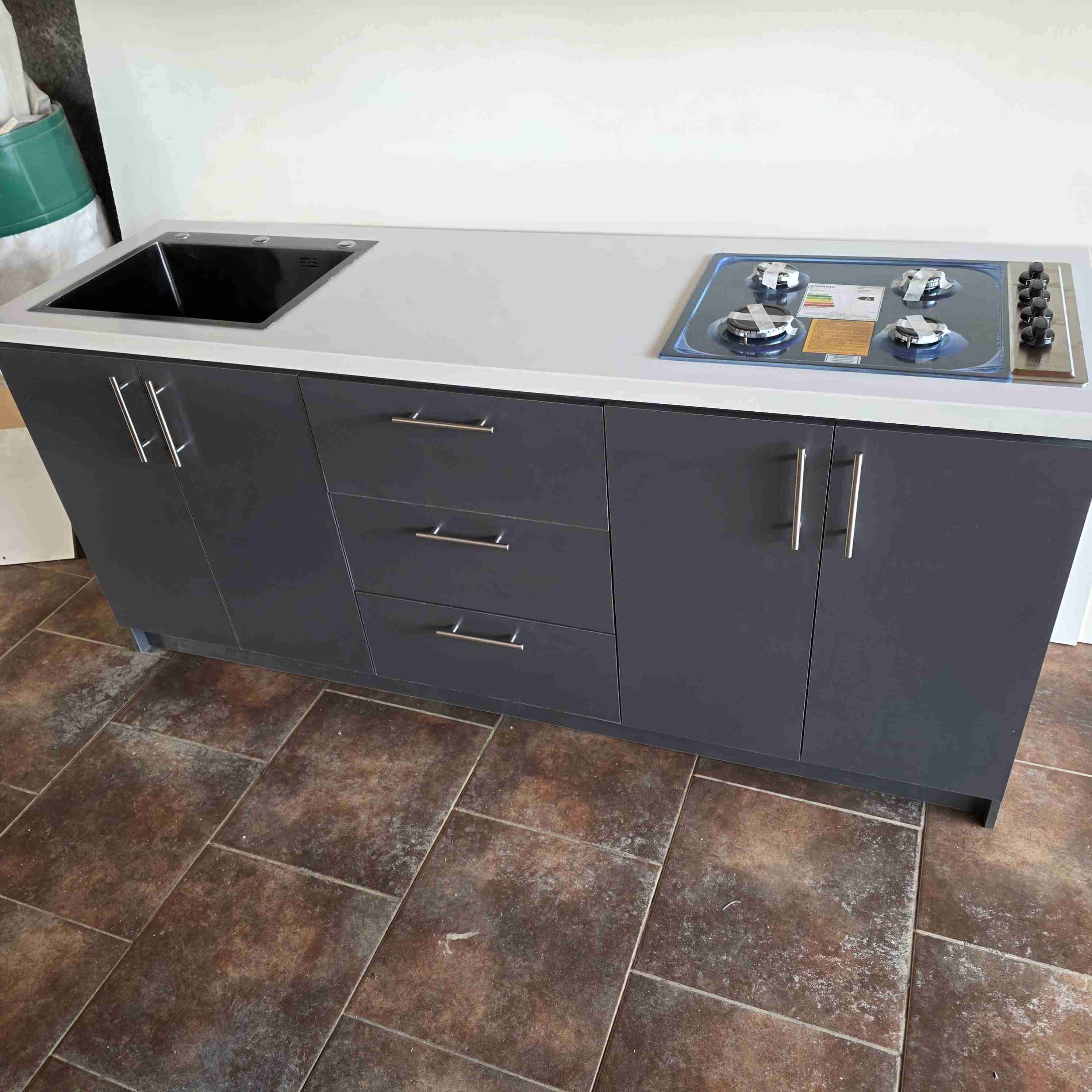 Mueble de cocina con encimera integrada, lavaplatos diseño moderno y funcional. Ideal para remodelaciones. Medidas 2 x90x60
