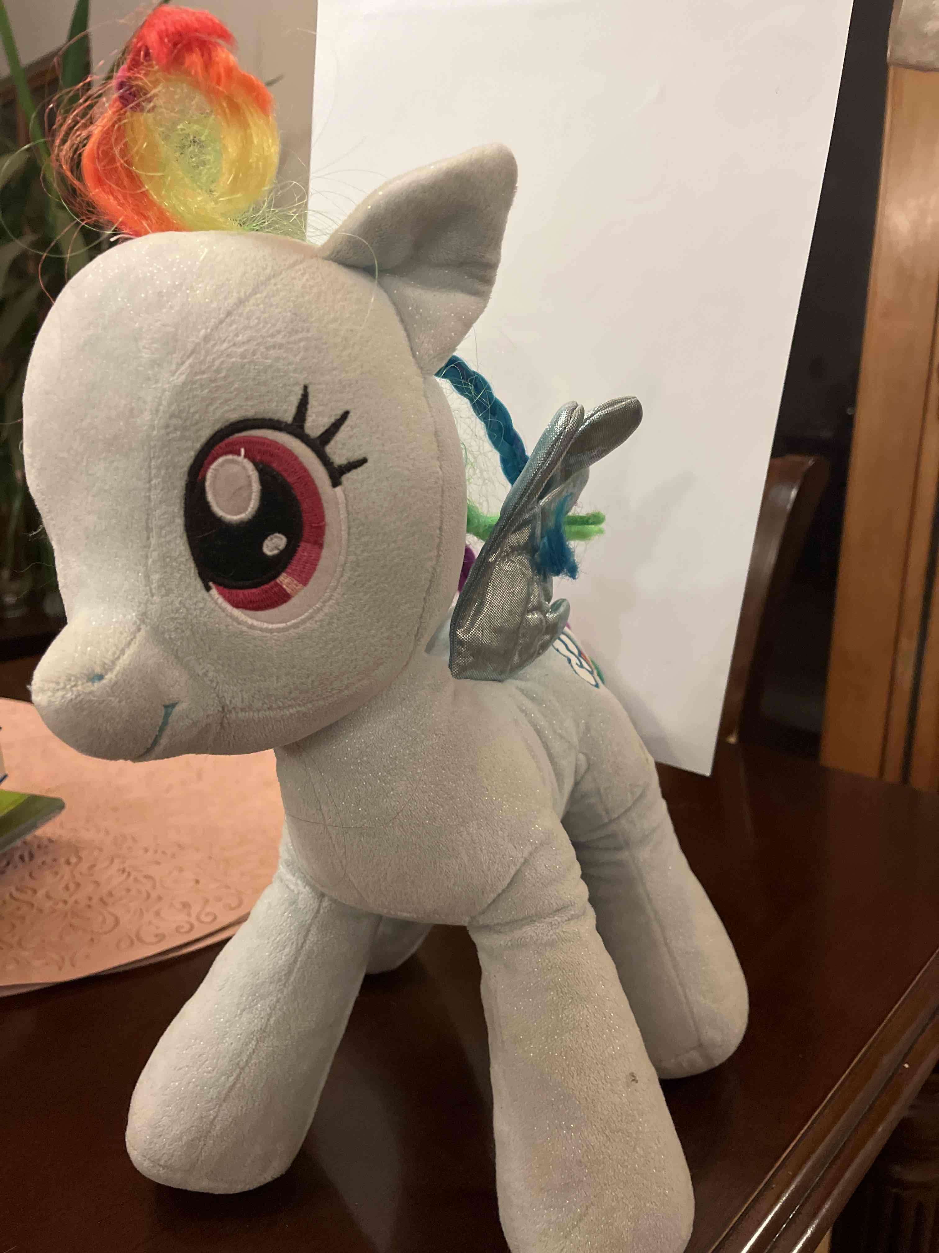 Peluche de unicornio con melena colorida. En buen estado, ideal para decorar o como juguete infantil.