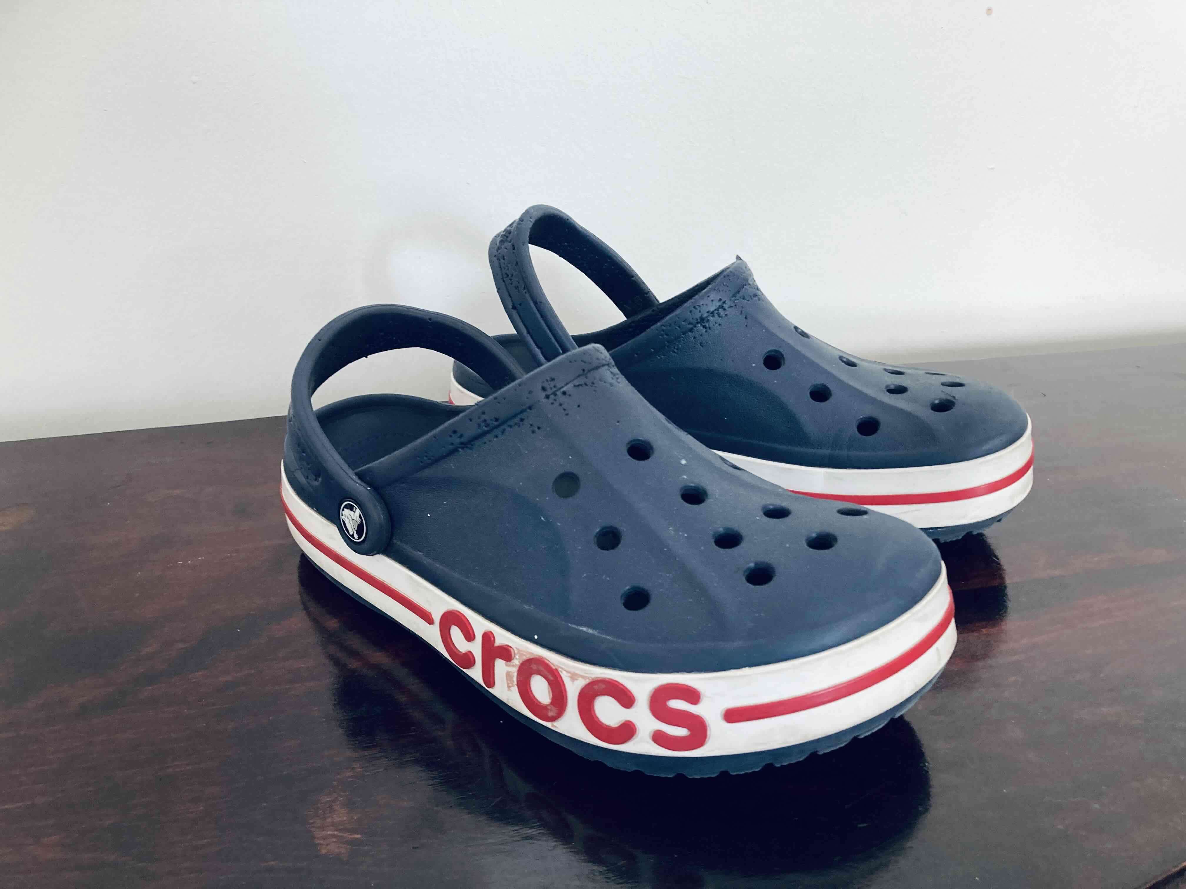 Zuecos Crocs cómodos y prácticos en color azul marino con detalles en rojo. En buen estado, ideales para uso diario. Solo uso en casa