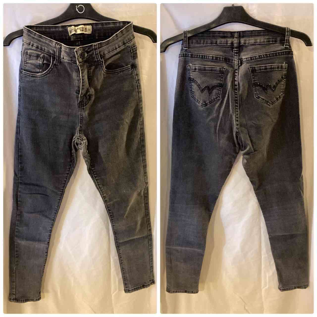 Jeans casuales de mezclilla en tono gris oscuro. En buen estado y perfectos para uso diario. Con desgaste entrepiernas.
