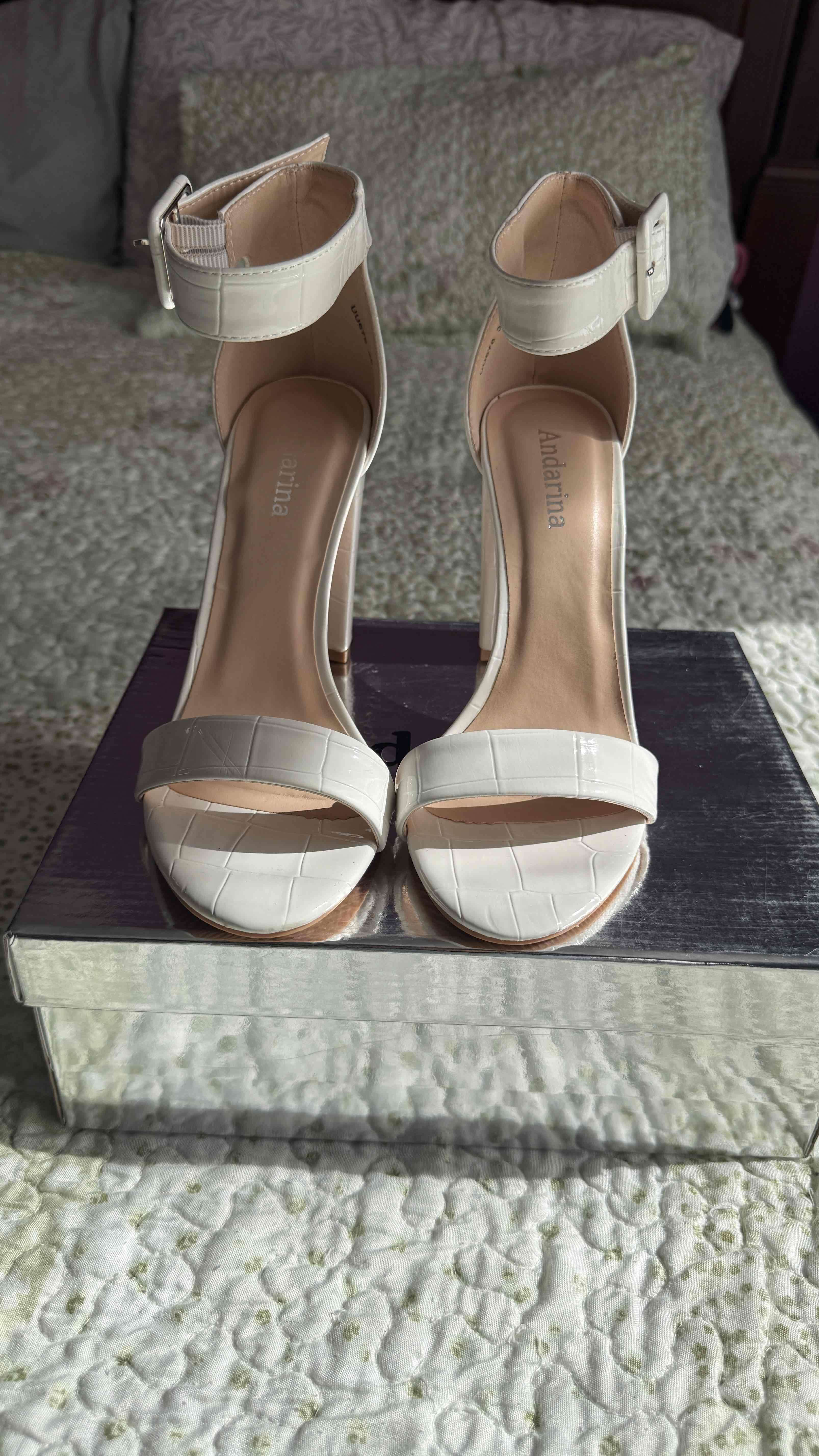 Elegantes sandalias de tacón alto en color blanco, perfectas para ocasiones especiales. Buen estado, con leves signos de uso.