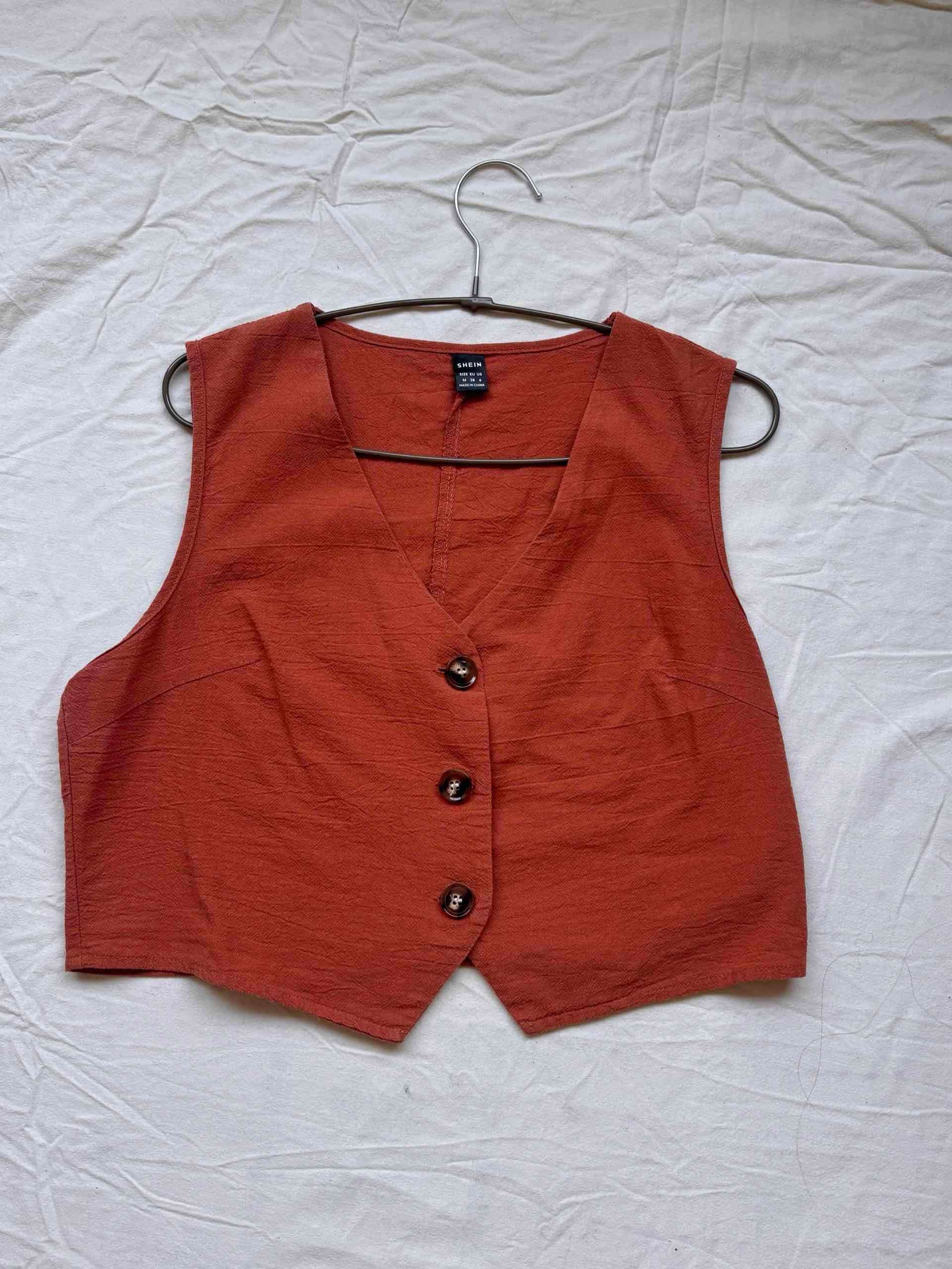 Chaleco sin mangas en color terracota con botones frontales. Ideal para un look casual. En buen estado general.