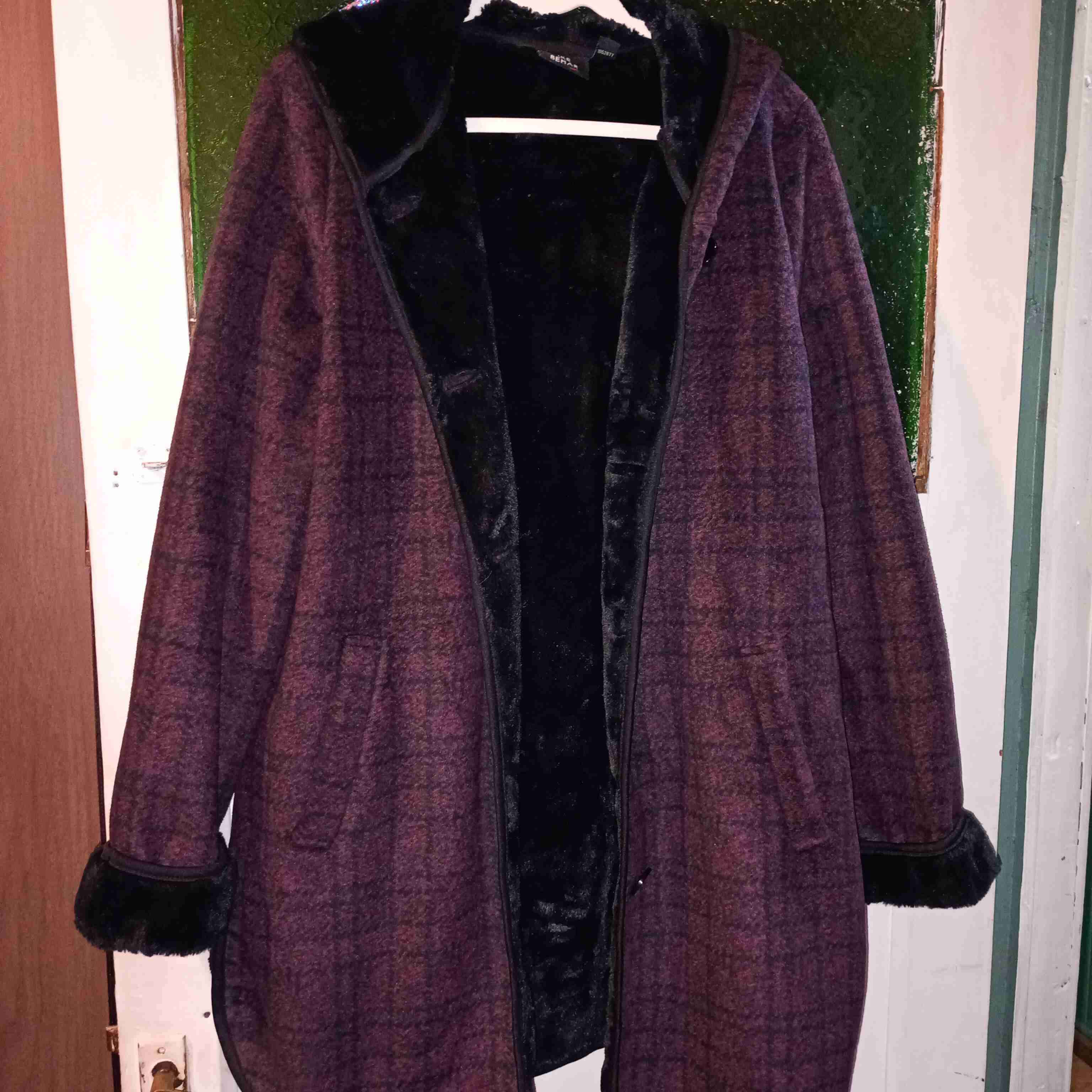 Abrigo largo de invierno, color morado con forro negro de peluche. Ideal para el frío.