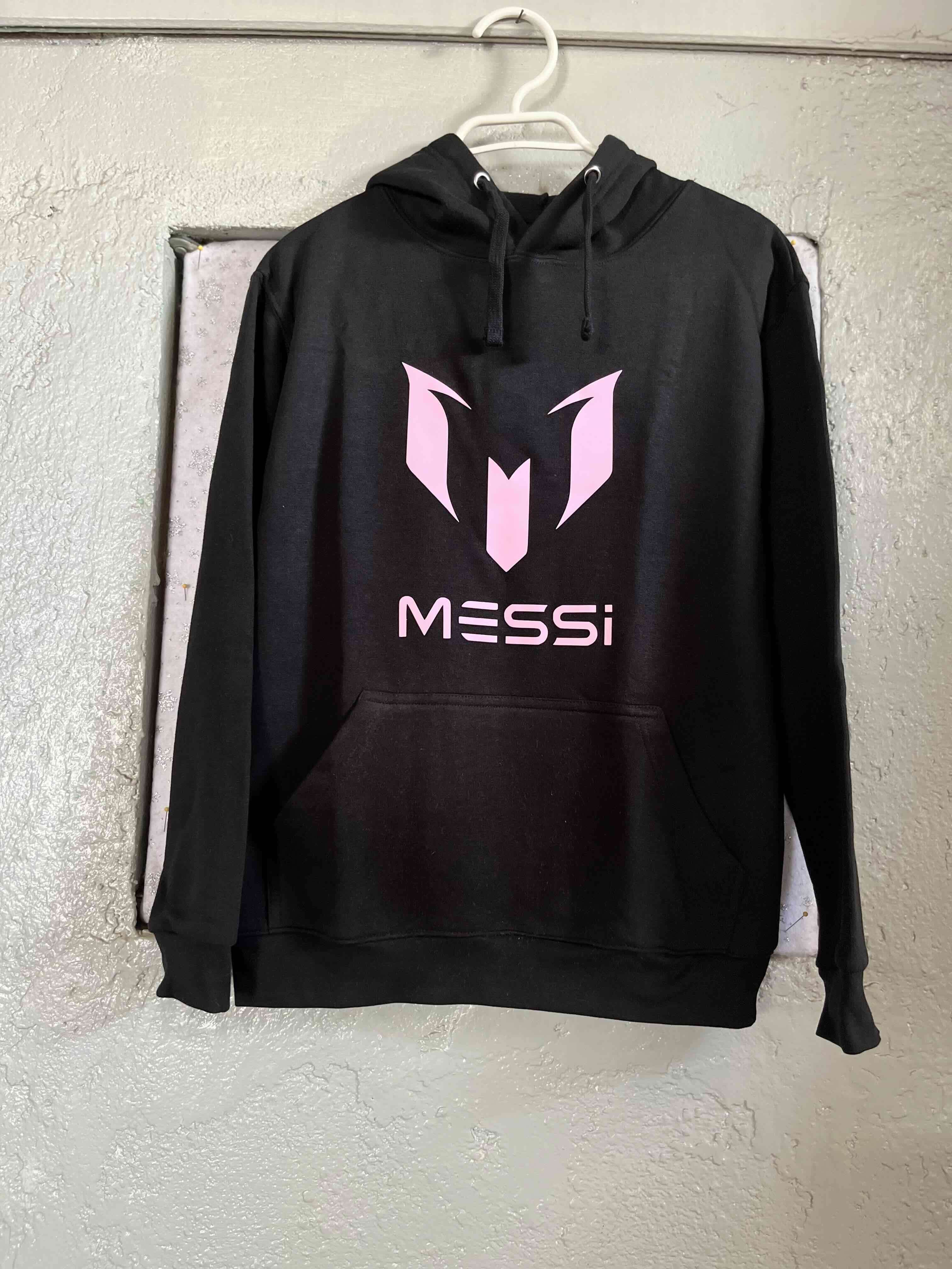 Cómodo polerón negro con logo Messi en rosado. Ideal para días fríos, se ve en buen estado.