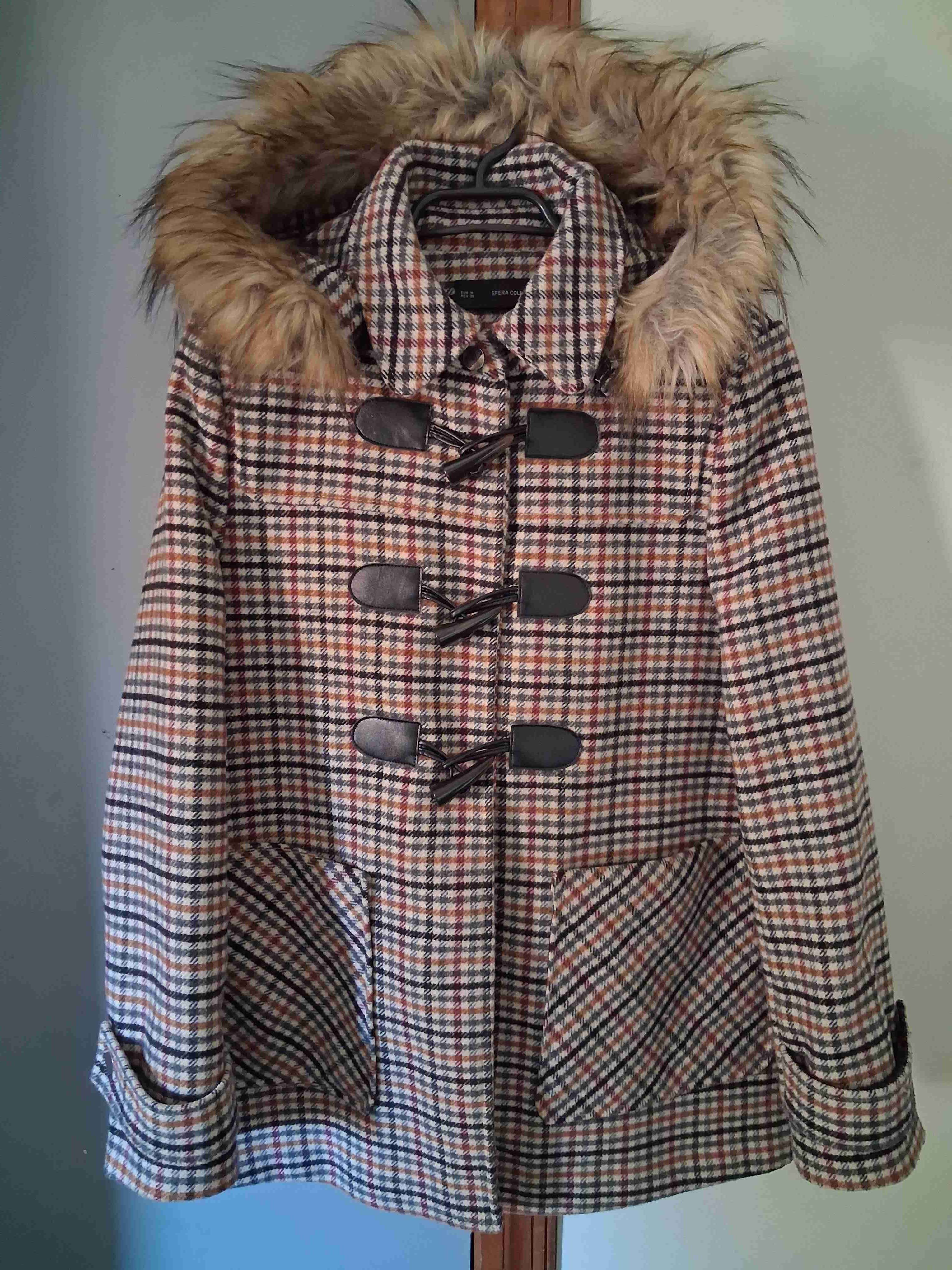 Abrigo estilo trench a cuadros con capucha de pelo sintético. Ideal para el invierno, en perfecto estado.