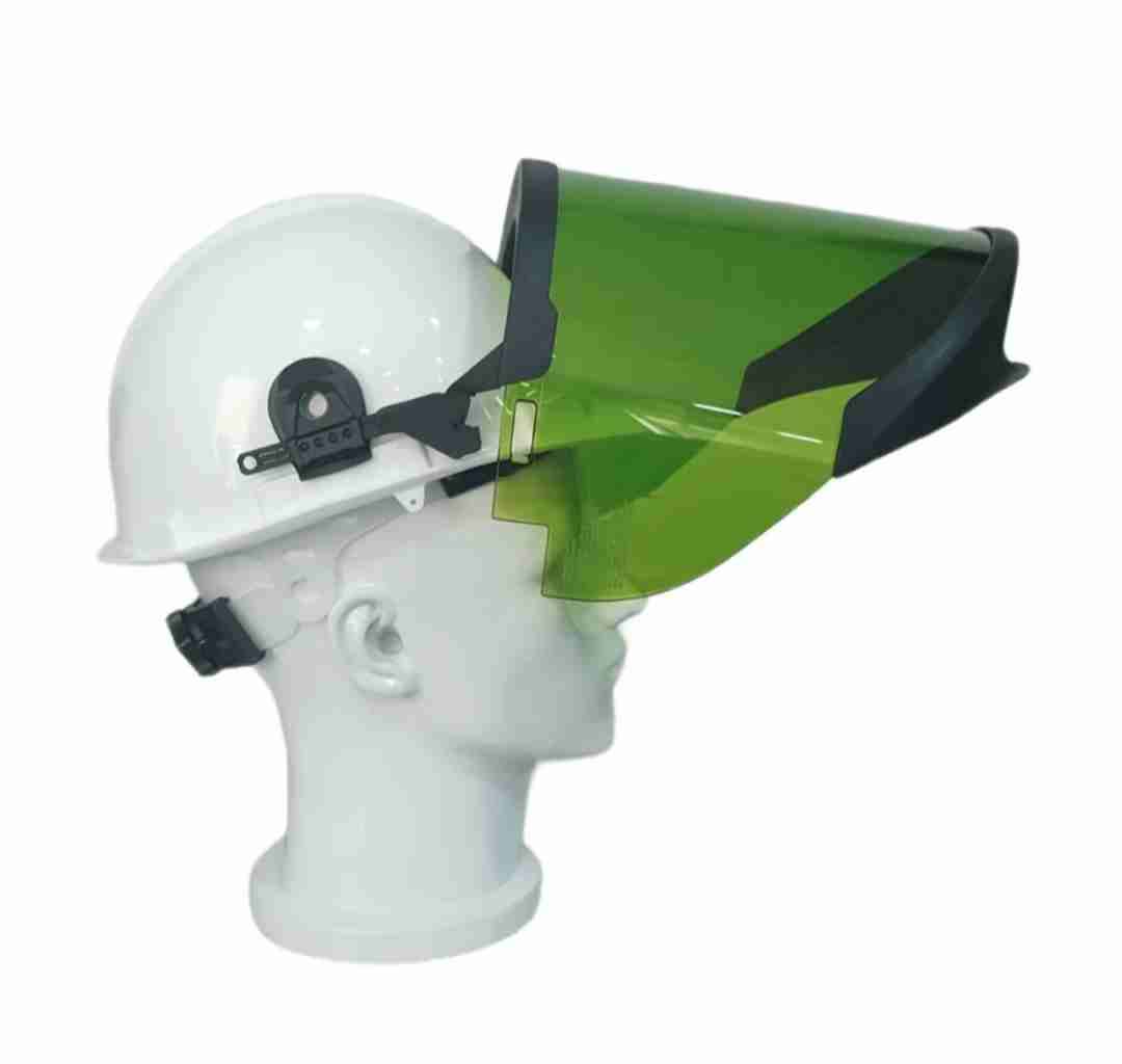 Casco protector blanco con visor verde ajustable, ideal para seguridad industrial. En buen estado, ligero desgaste.