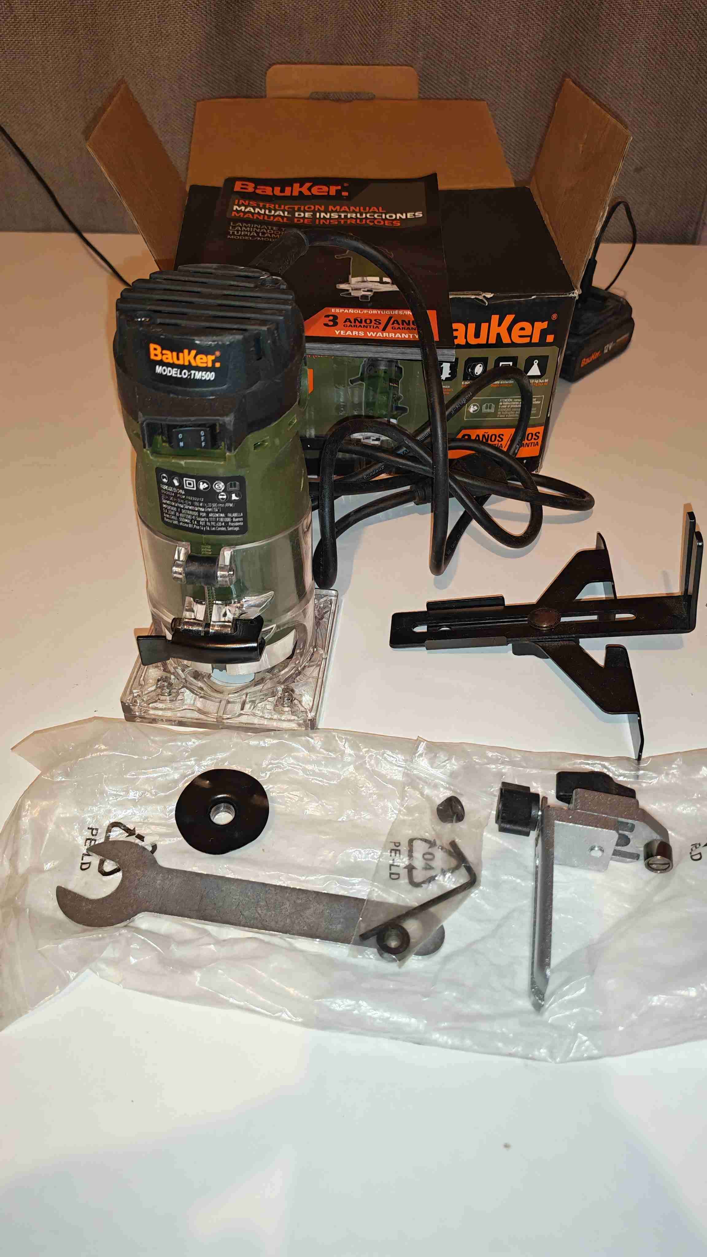 Fresadora Bauker en buen estado, ideal para trabajos de carpintería. Incluye accesorios y manual original.