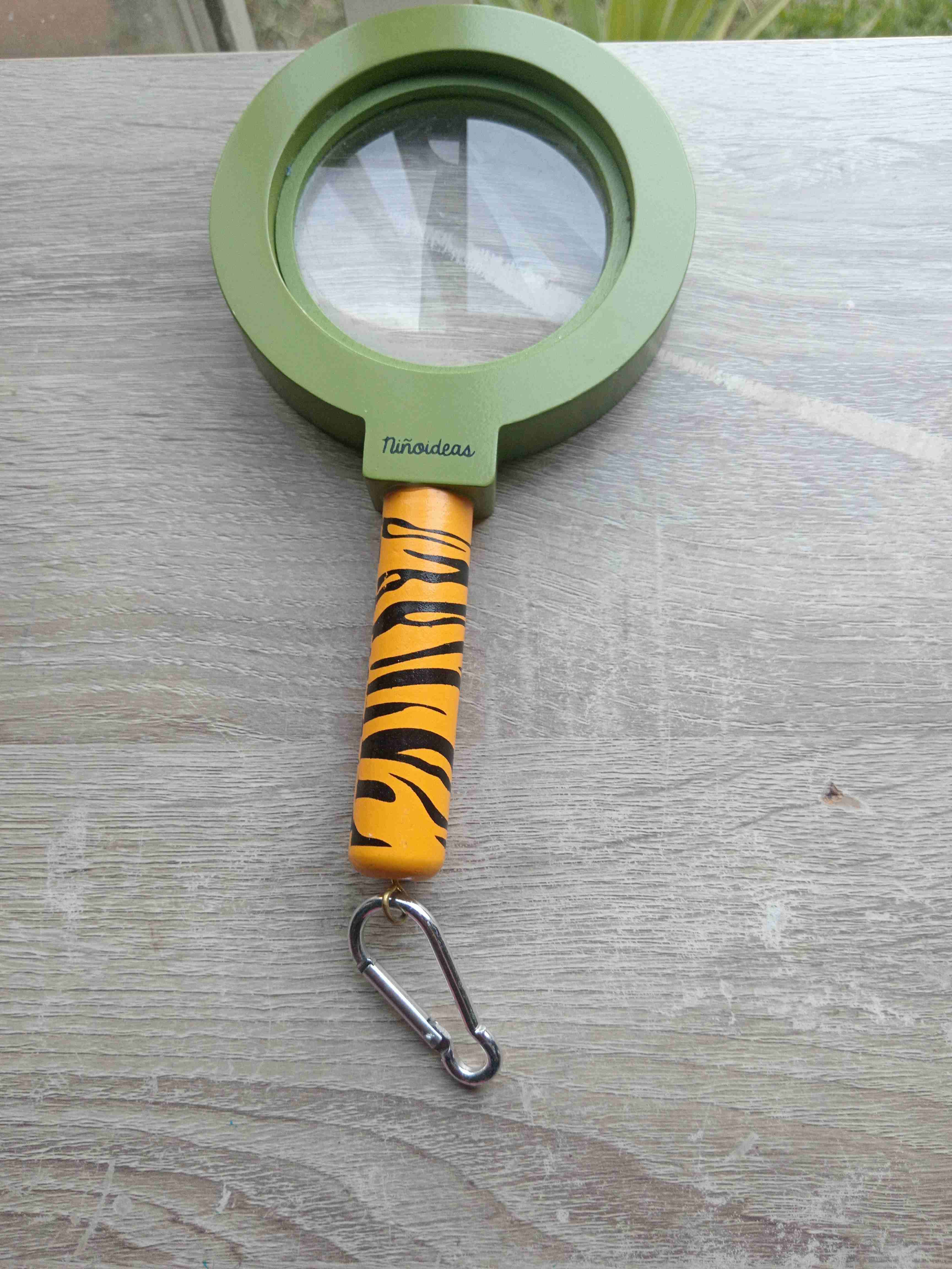 Lupa con mango de tigre, ideal para explorar. En buen estado, diseño atractivo para niños.