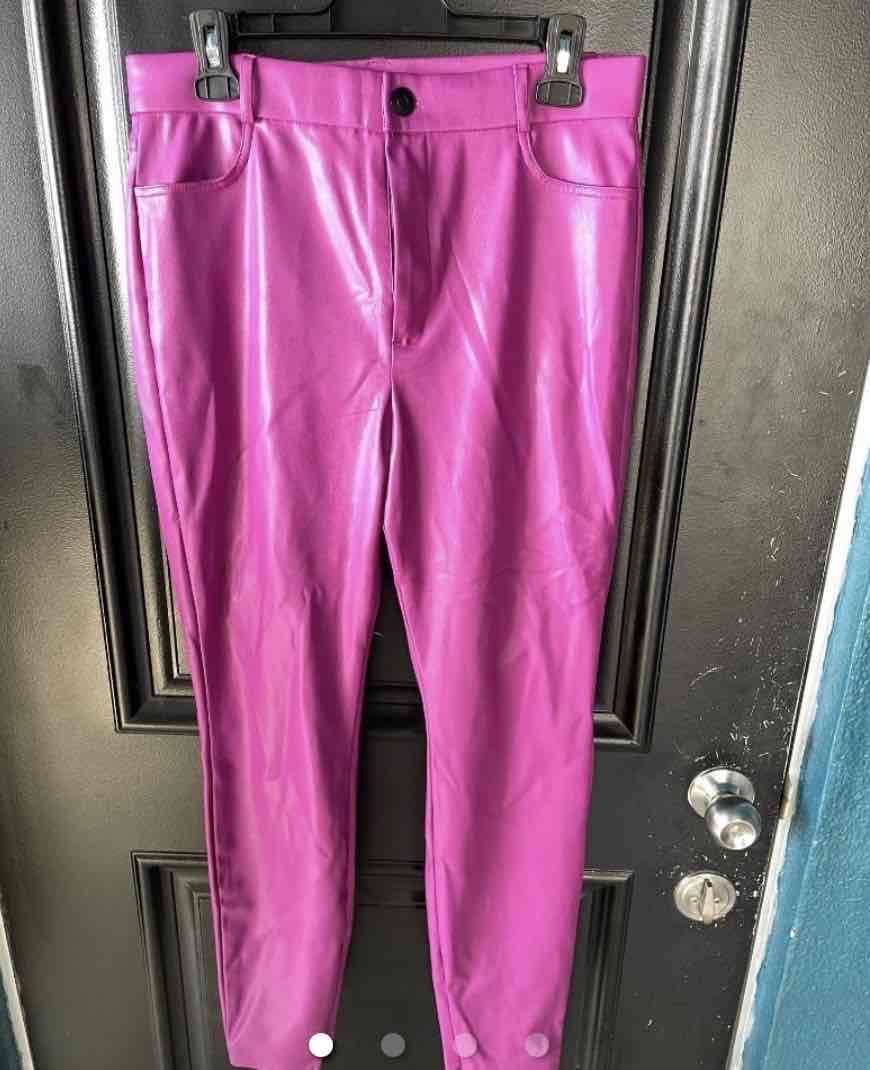 Pantalones llamativos de cuero sintético fucsia, perfectos para un look audaz. Se encuentran en buen estado, ideal para fiestas o salidas casuales.