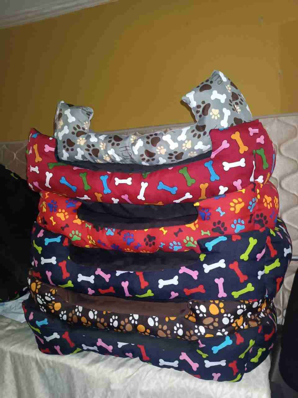 Camas acolchadas y coloridas para mascotas, ideales para brindar comodidad. Diseños con huesos y patas. Estado nuevo y perfectas para el descanso de tu mascota.