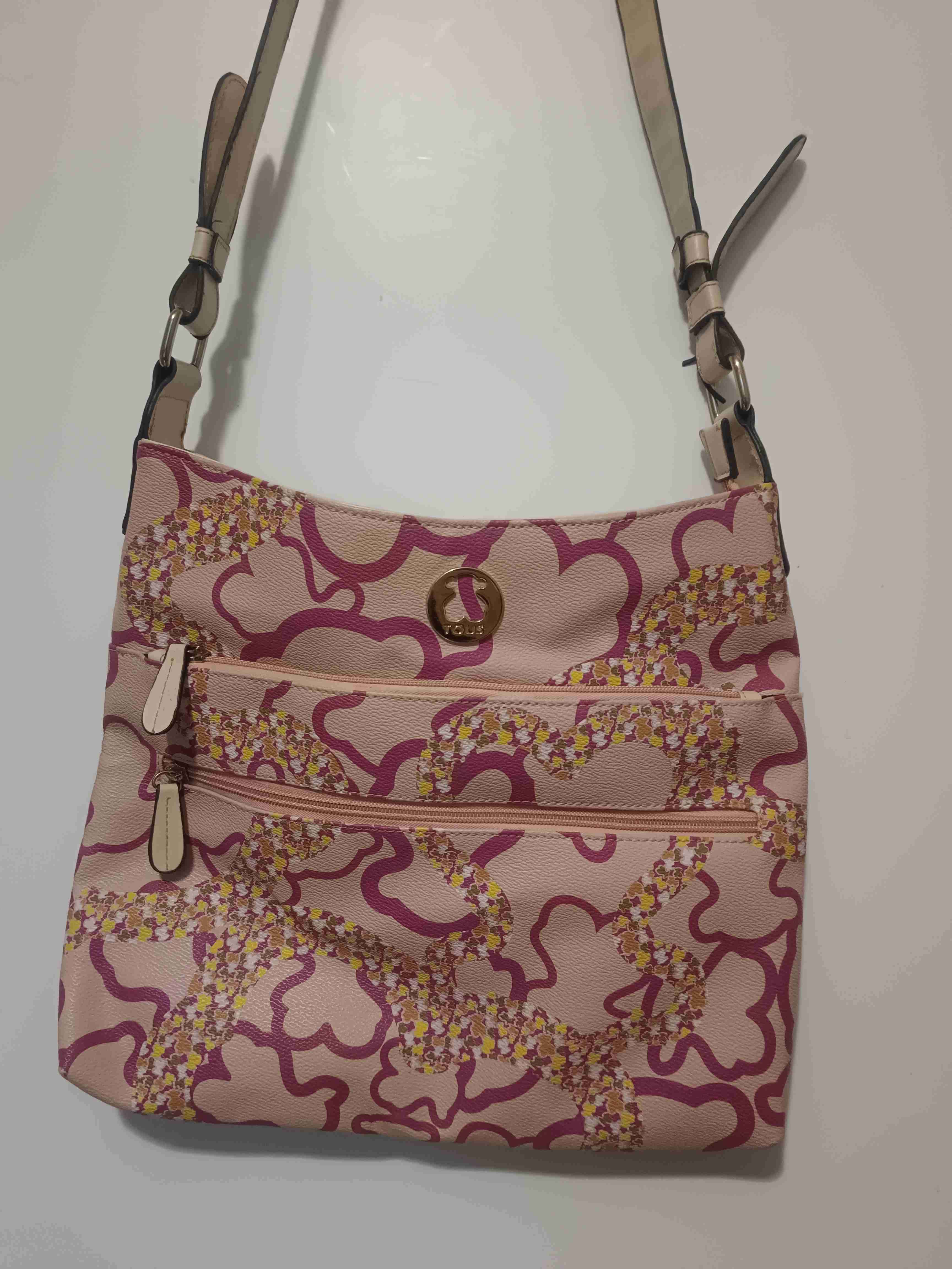 Cartera de tamaño mediano, ideal para uso diario. Diseño floral en tonos rosa y beige, en buen estado.