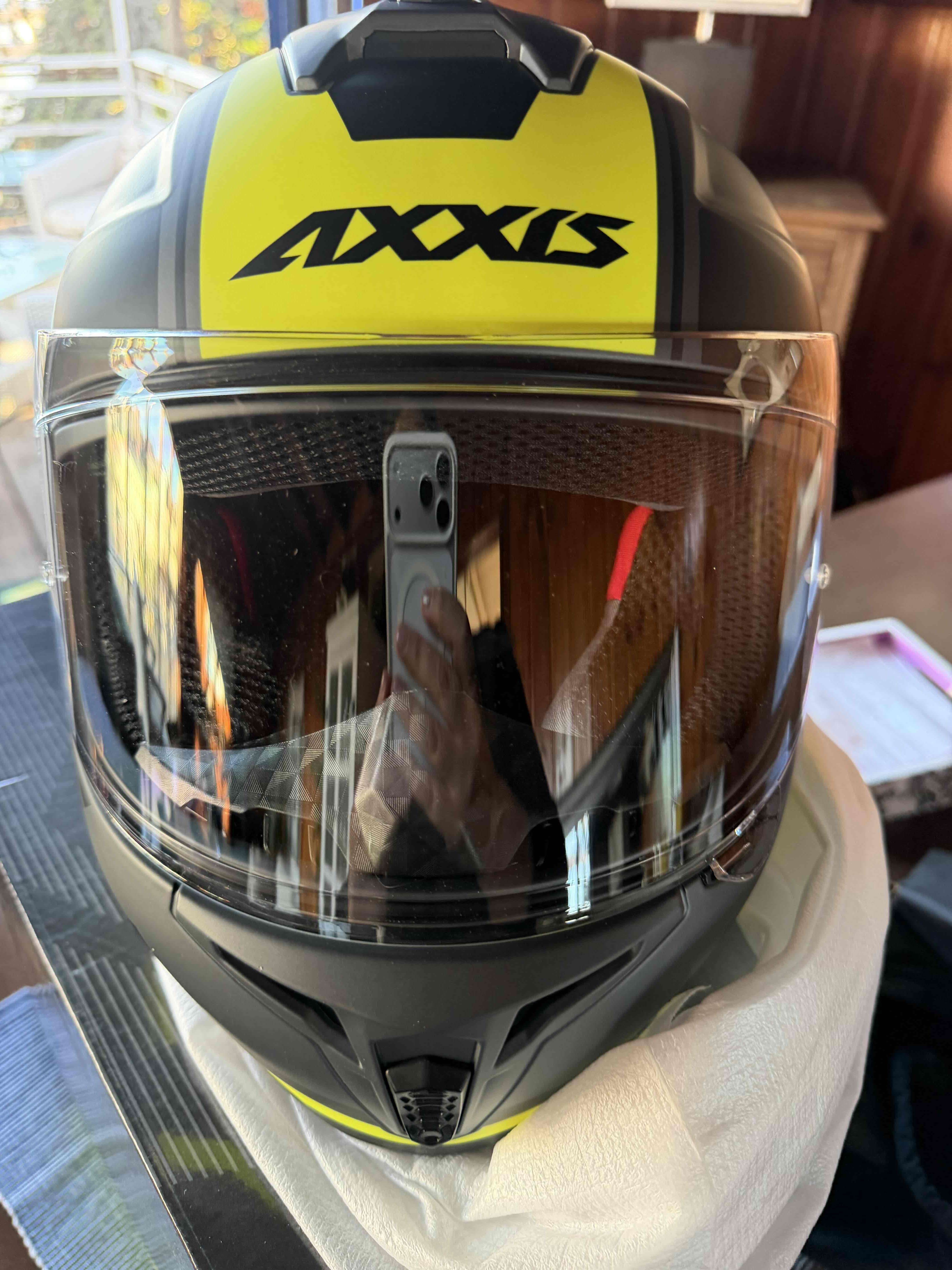 Casco de moto Axxis en negro y amarillo, en excelente estado. Perfecto para mayor seguridad y estilo al conducir.