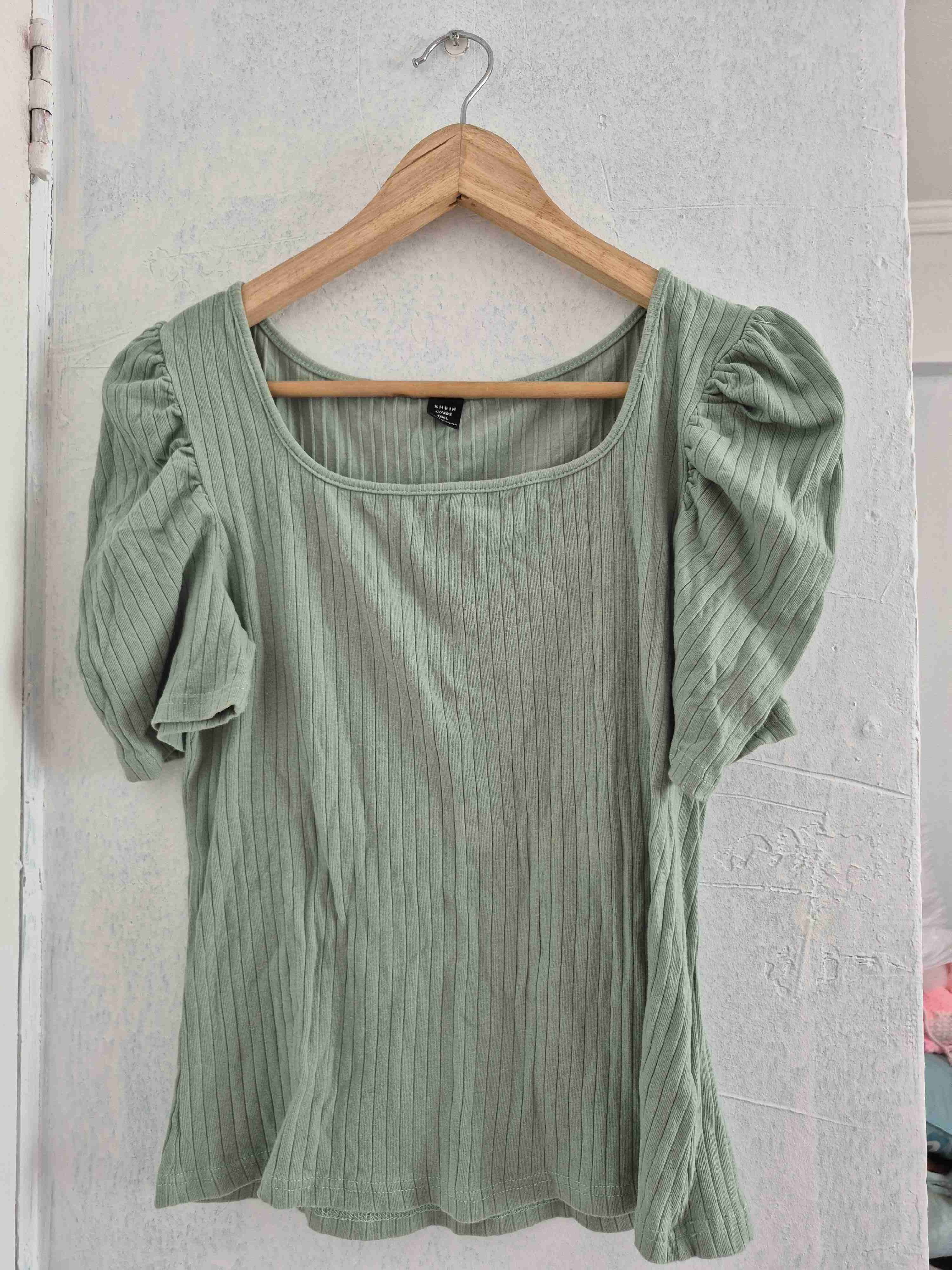 Blusa de color verde con textura acanalada y mangas abullonadas. Perfecta para un look casual. Está en buen estado.