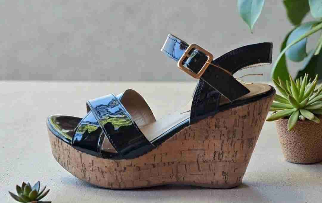 Sandalias Gacel negras de charol con plataforma de corcho. Elegantes y cómodas para el verano.