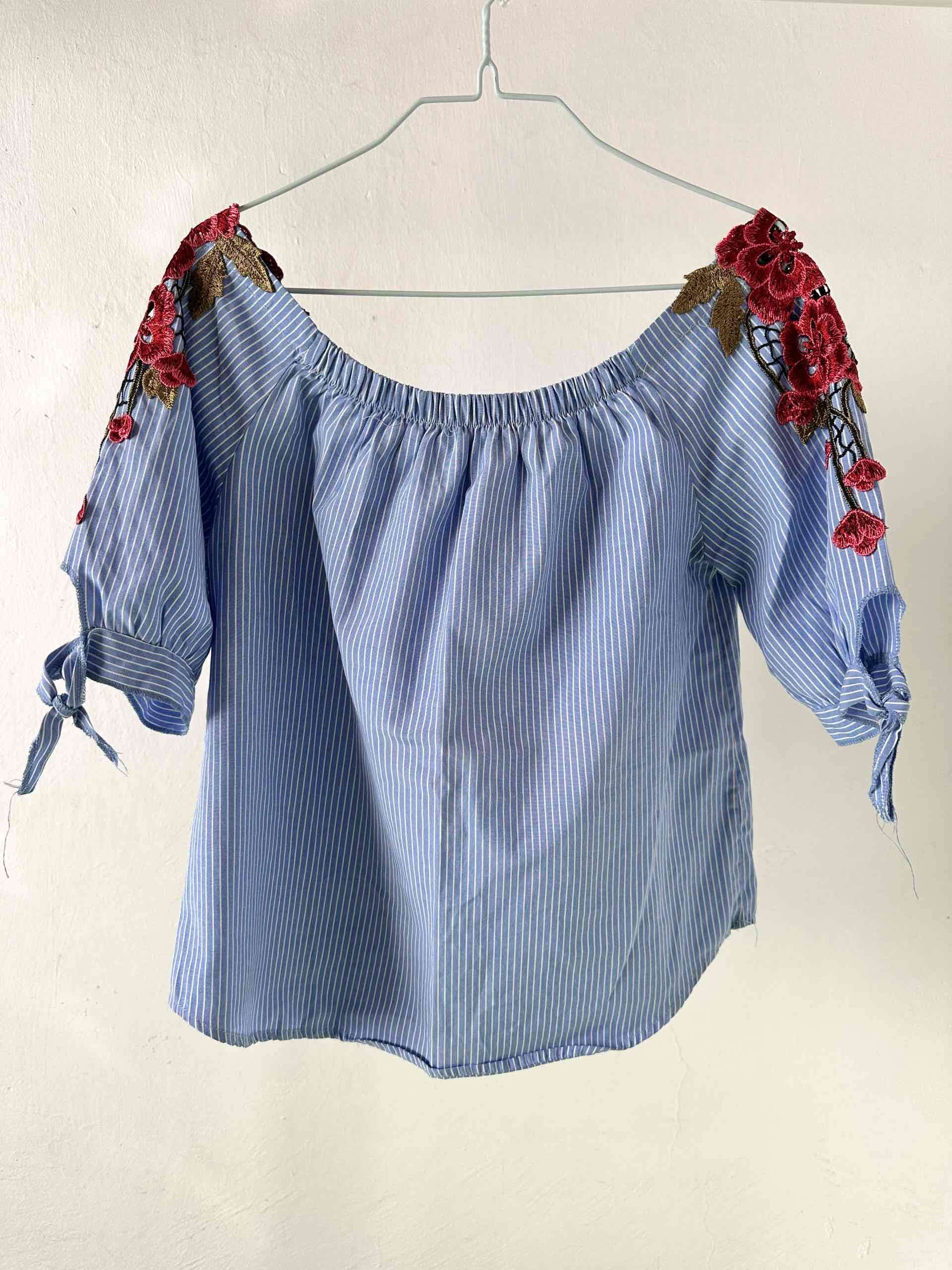 Blusa de mujer a rayas celestes con bordados florales en los hombros. Perfecta para un look casual y veraniego. En buen estado.