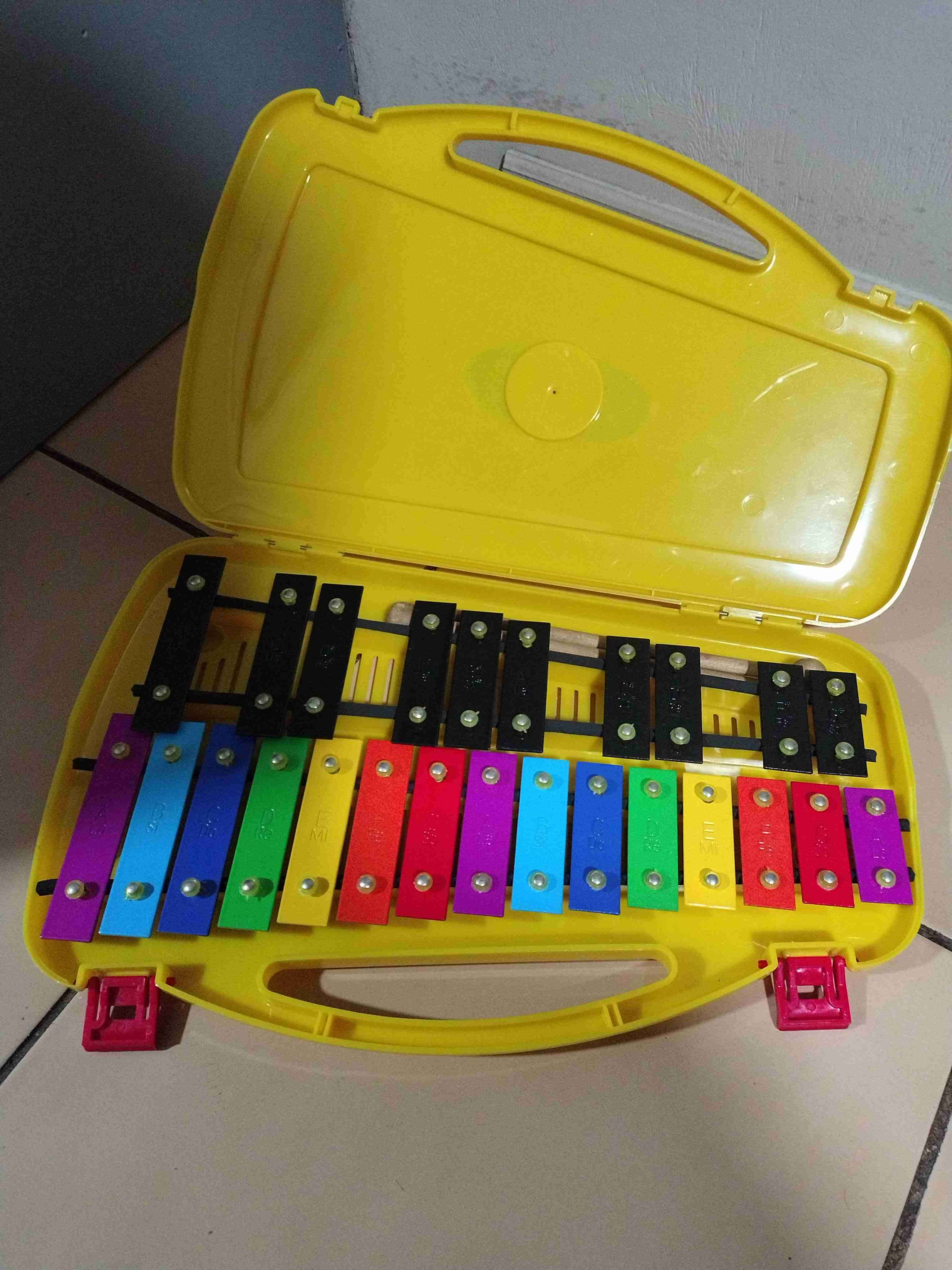 Xilófono infantil en estuche amarillo, ideal para la iniciación musical de los niños. Buen estado general, con leves signos de uso.