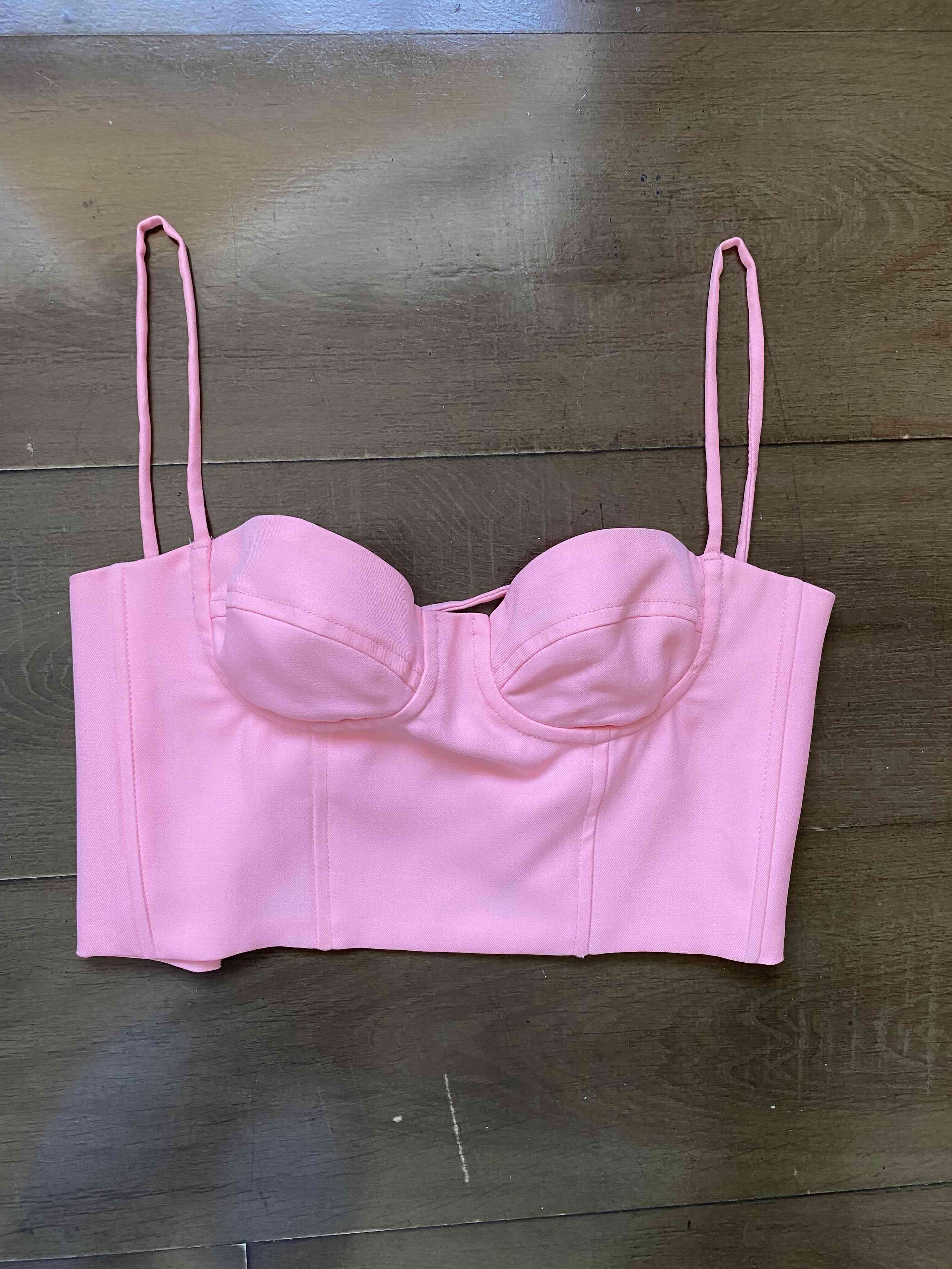 Top corto de color rosado con tirantes delgados. Talla xs o sosten copa 36 a/b
