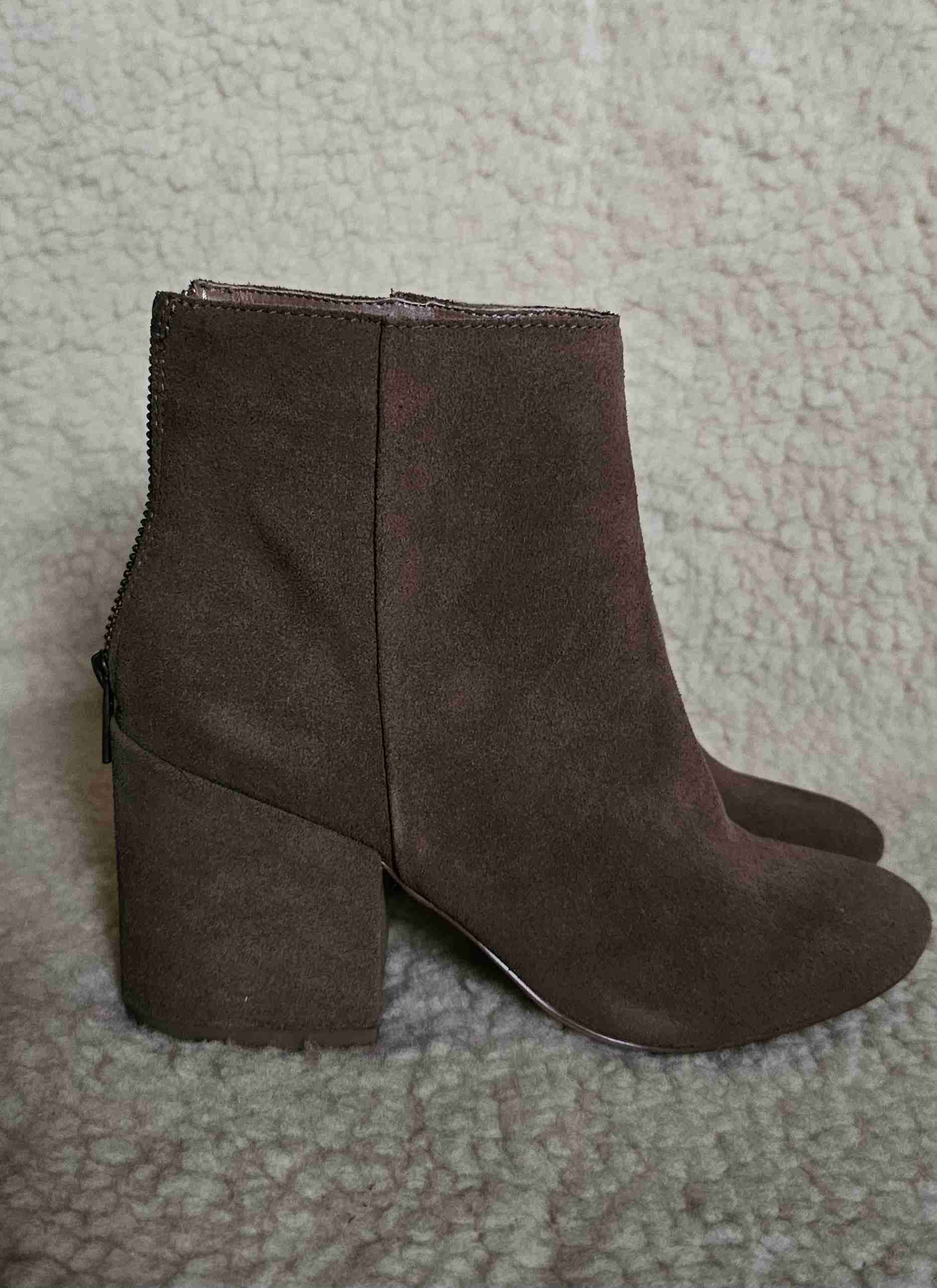 Elegantes botines de gamuza real en color marrón,con cierre trasero,perfectos para el otoño. Buen estado con signos leves de uso.