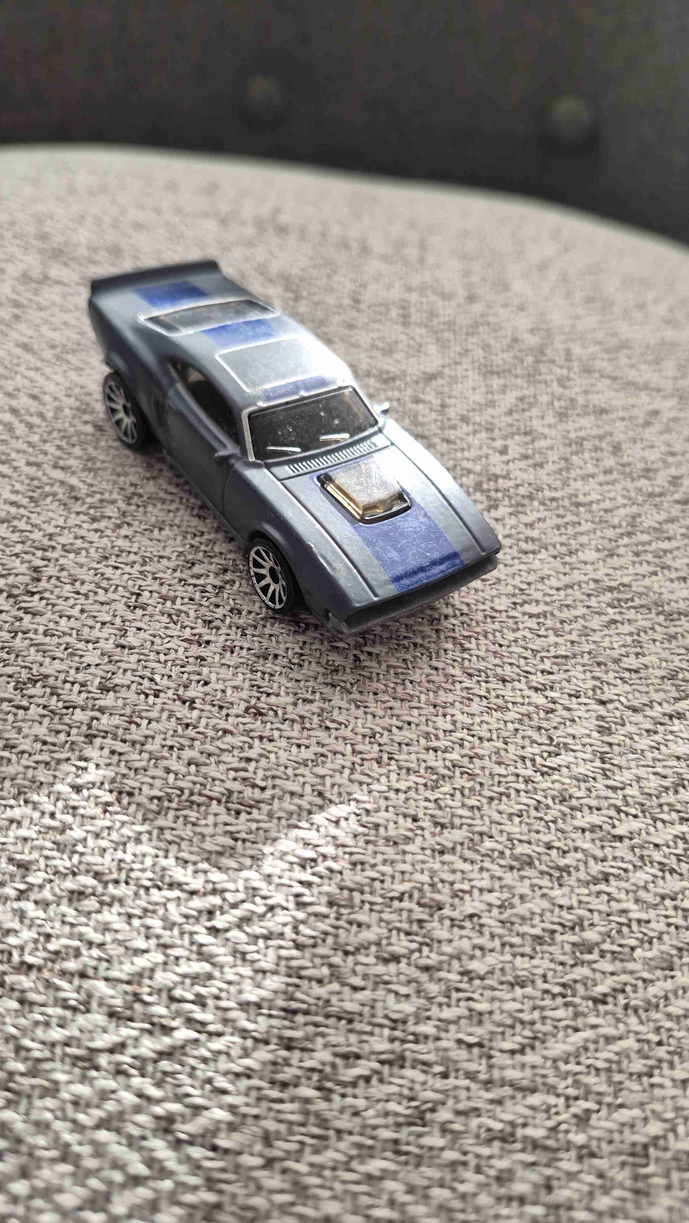 Auto de juguete metálico con detalles en azul y negro. Perfecto para coleccionistas o para jugar.