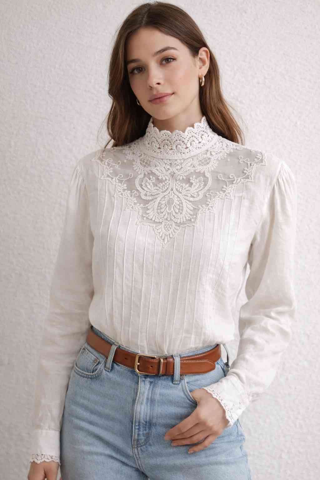 Elegante blusa blanca con detalle de encaje en el cuello. Perfecta para ocasiones formales. Buen estado. De lino, con botones forrados en la espalda.