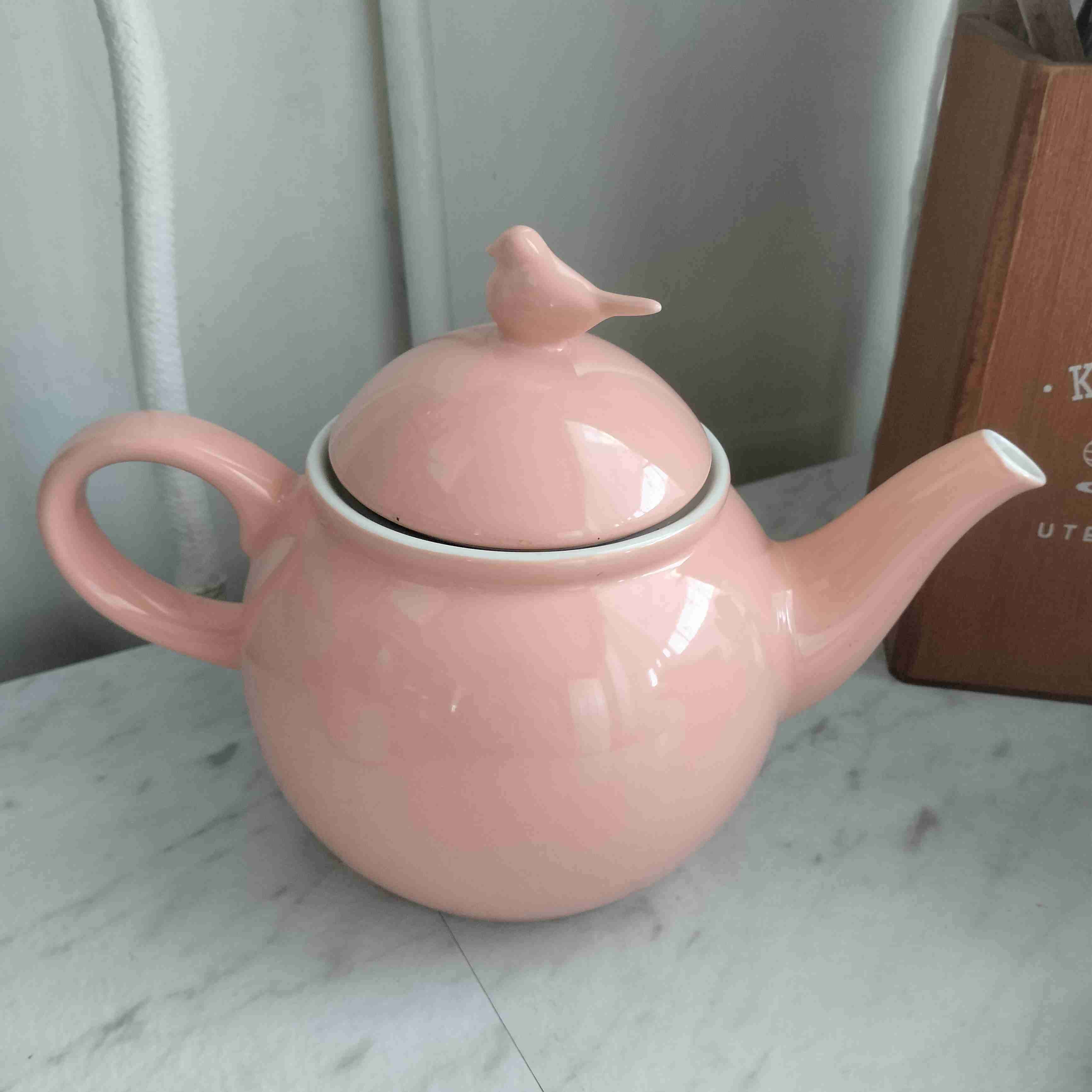 Elegante tetera de cerámica rosada con adorno de pajarito. Ideal para decorar y servir té en casa. Nueva sin caja.