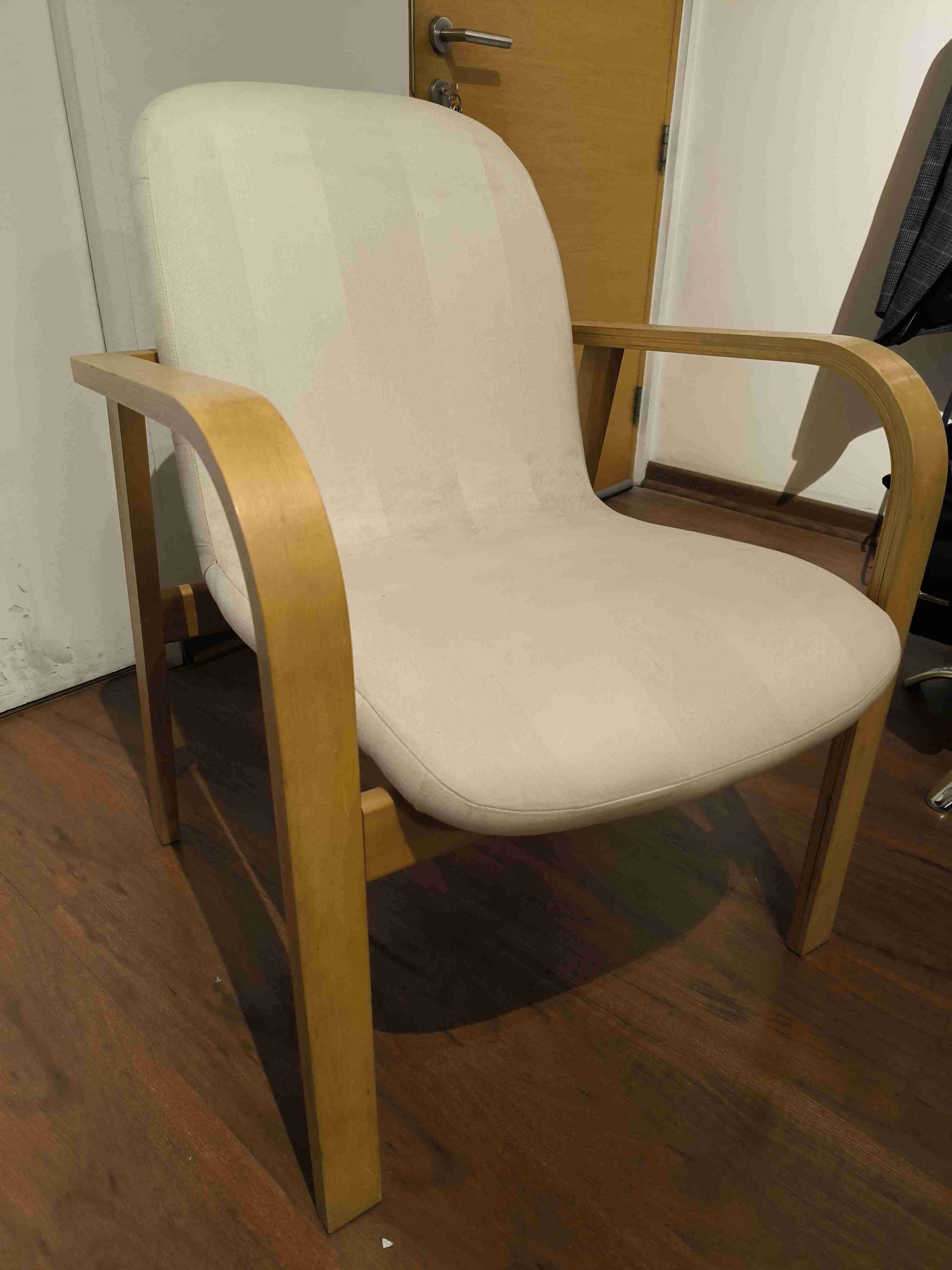 Cómodo sitial con estructura de madera muy fina y cojín beige. Ideal para salas o escritorios. En buen estado general. 3 unidades disponibles.