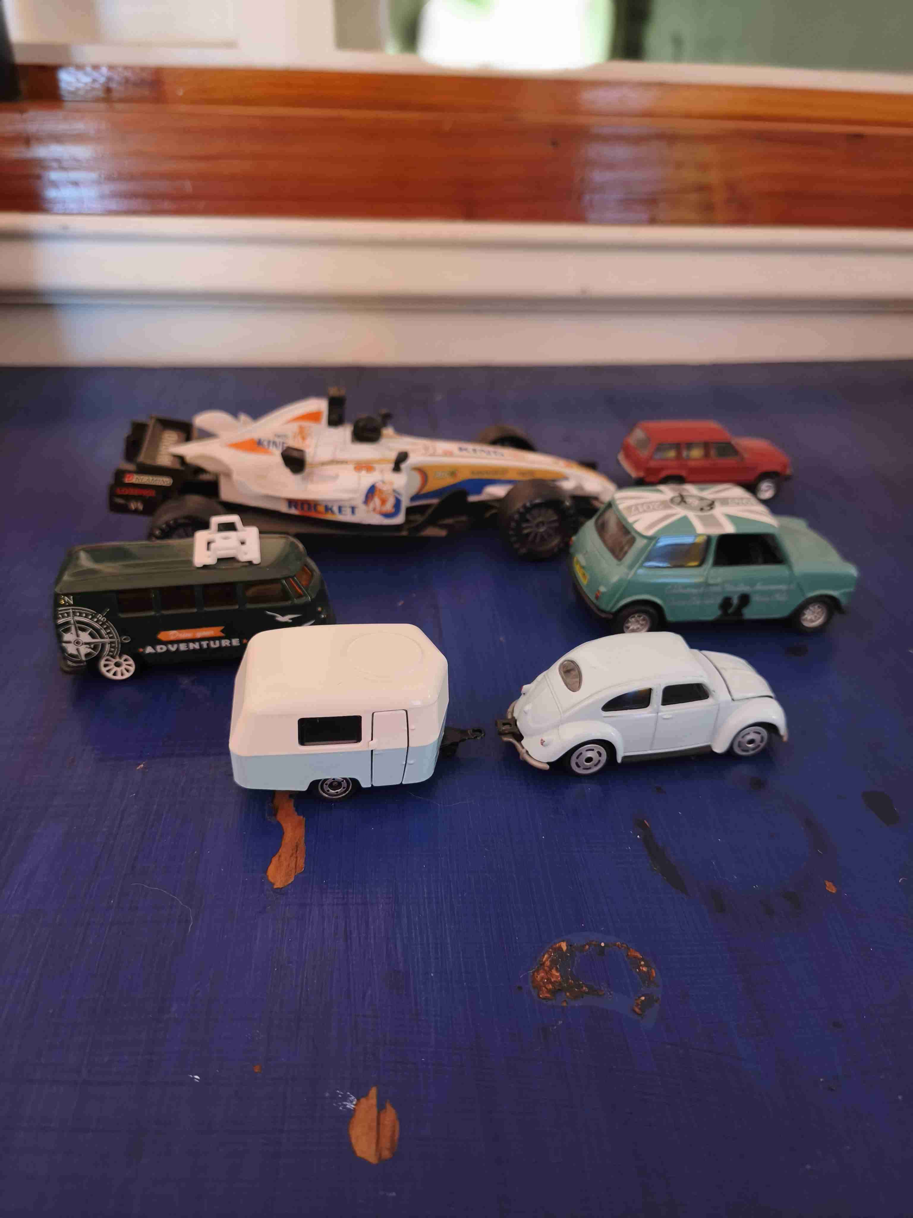 Colección de autos de juguete de metal en buen estado (solo el de carrera es plástico). Ideal para coleccionistas o niños.