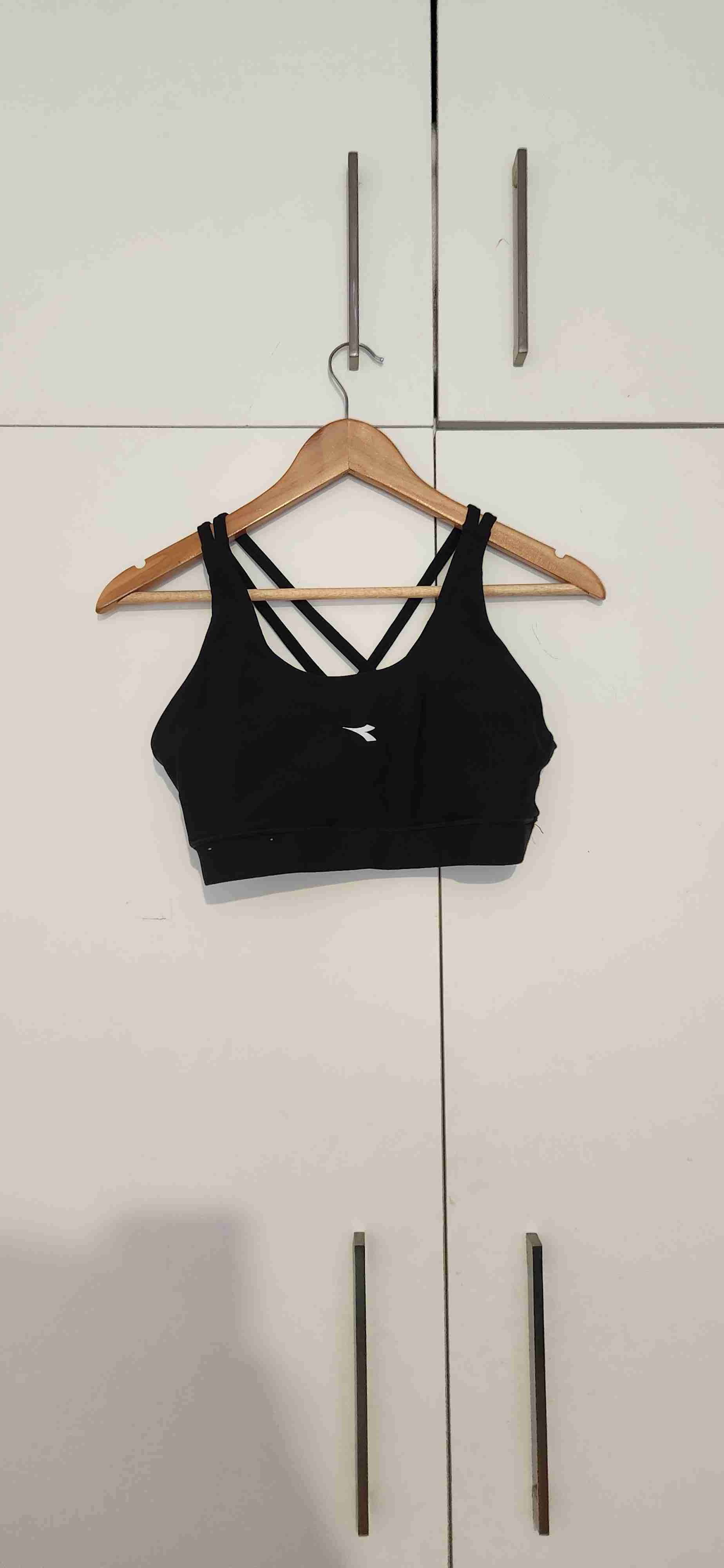 Top deportivo negro con tirantes cruzados, ideal para entrenar. Buen estado, cómodo y resistente.