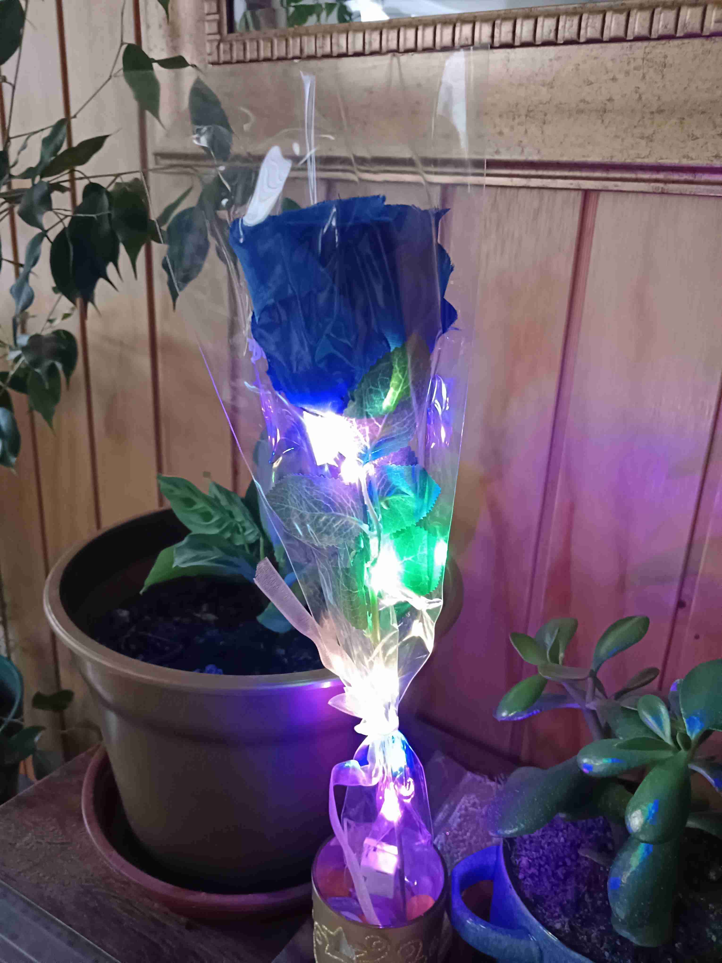 Hermosa rosa azul decorativa con luces LED de colores. Ideal para ambientar espacios interiores.usa pila tiene 3 posiciones de luz para regalar este día de la madre domingo 10 de mayo
