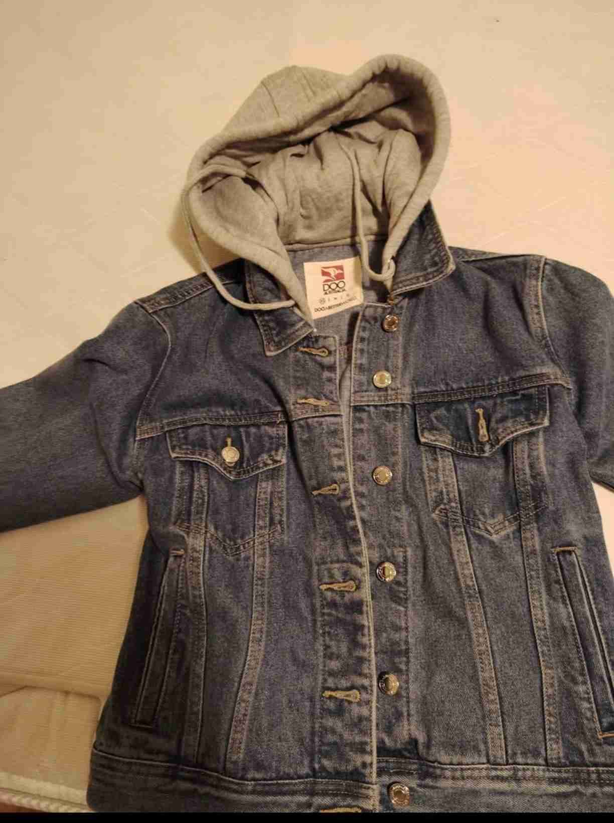 Chaqueta de mezclilla con interior de capucha gris. Ideal para un look casual y cómodo. Está en buen estado general.Talla xs