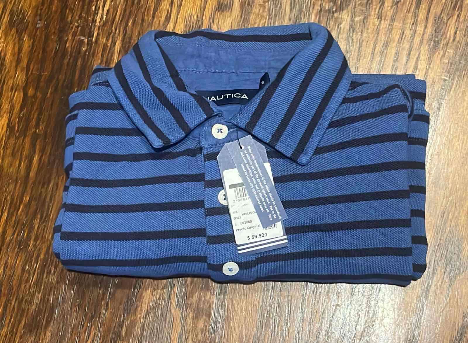 Polera azul con rayas negras, nueva y con etiqueta. Ideal para un estilo casual.
