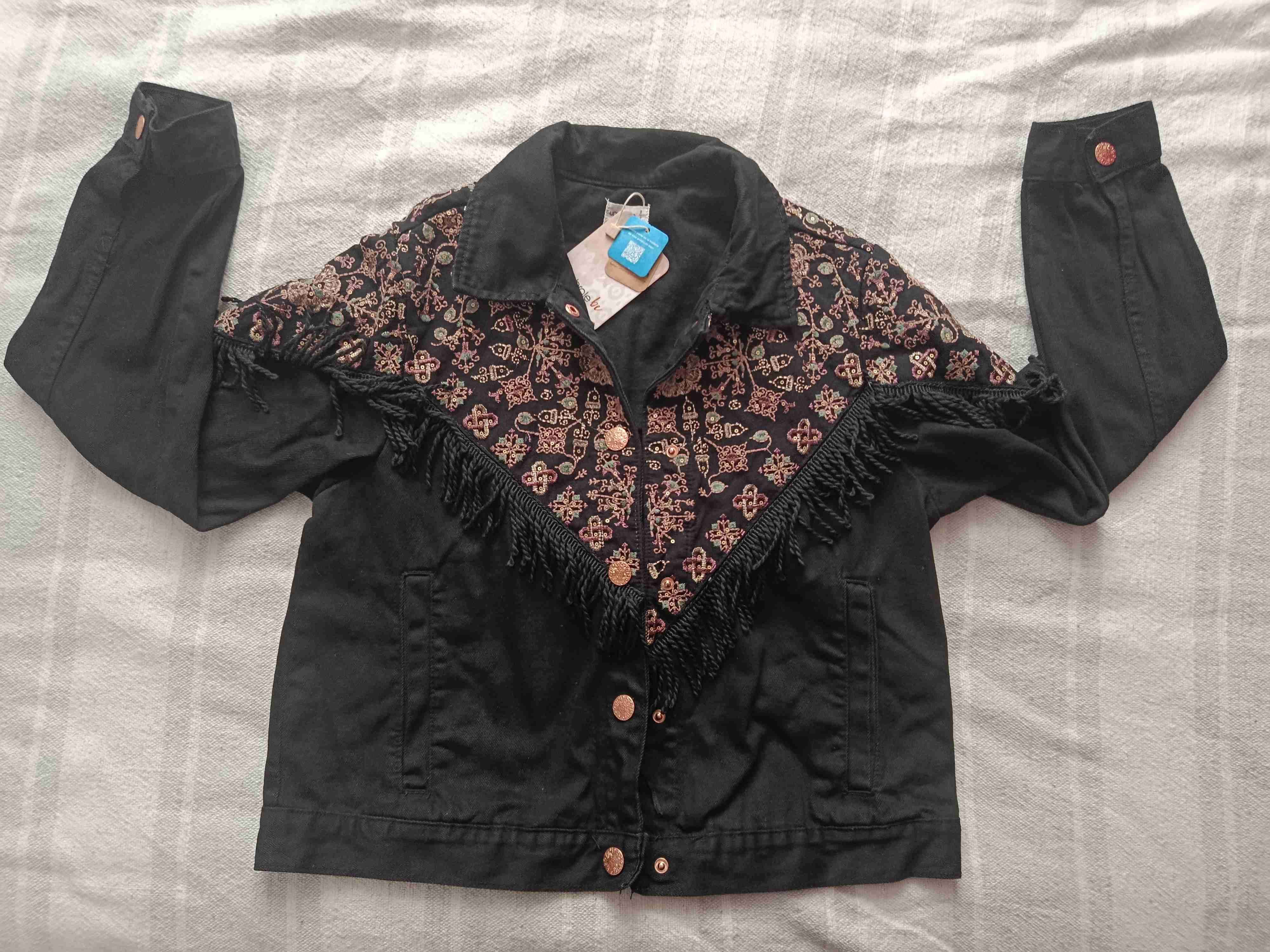Chaqueta negra con diseño étnico y flecos. Perfecta para días frescos. En buen estado.