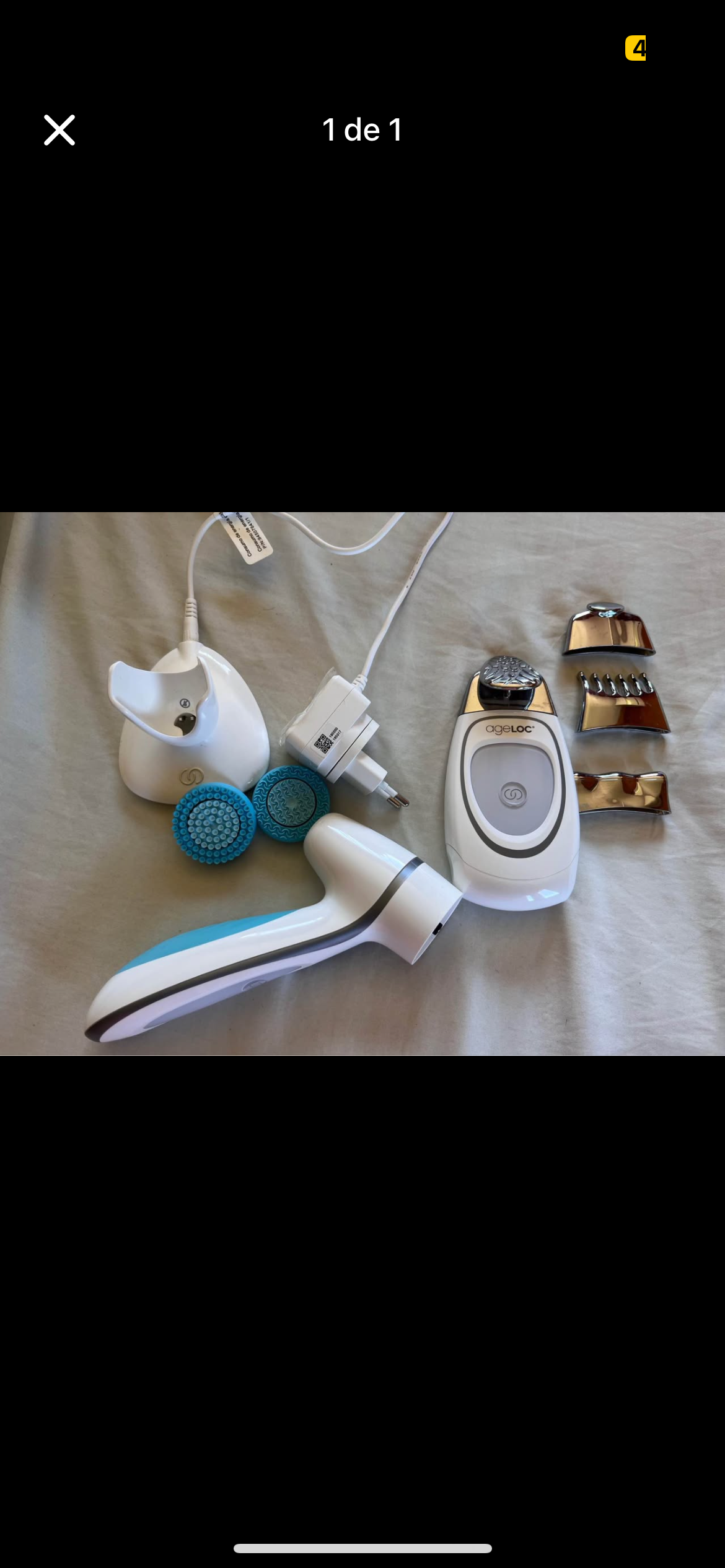 Kit completo de dispositivo facial anti-edad con accesorios de limpieza. Incluye cargador y cabezales intercambiables. En buen estado. Poco uso.