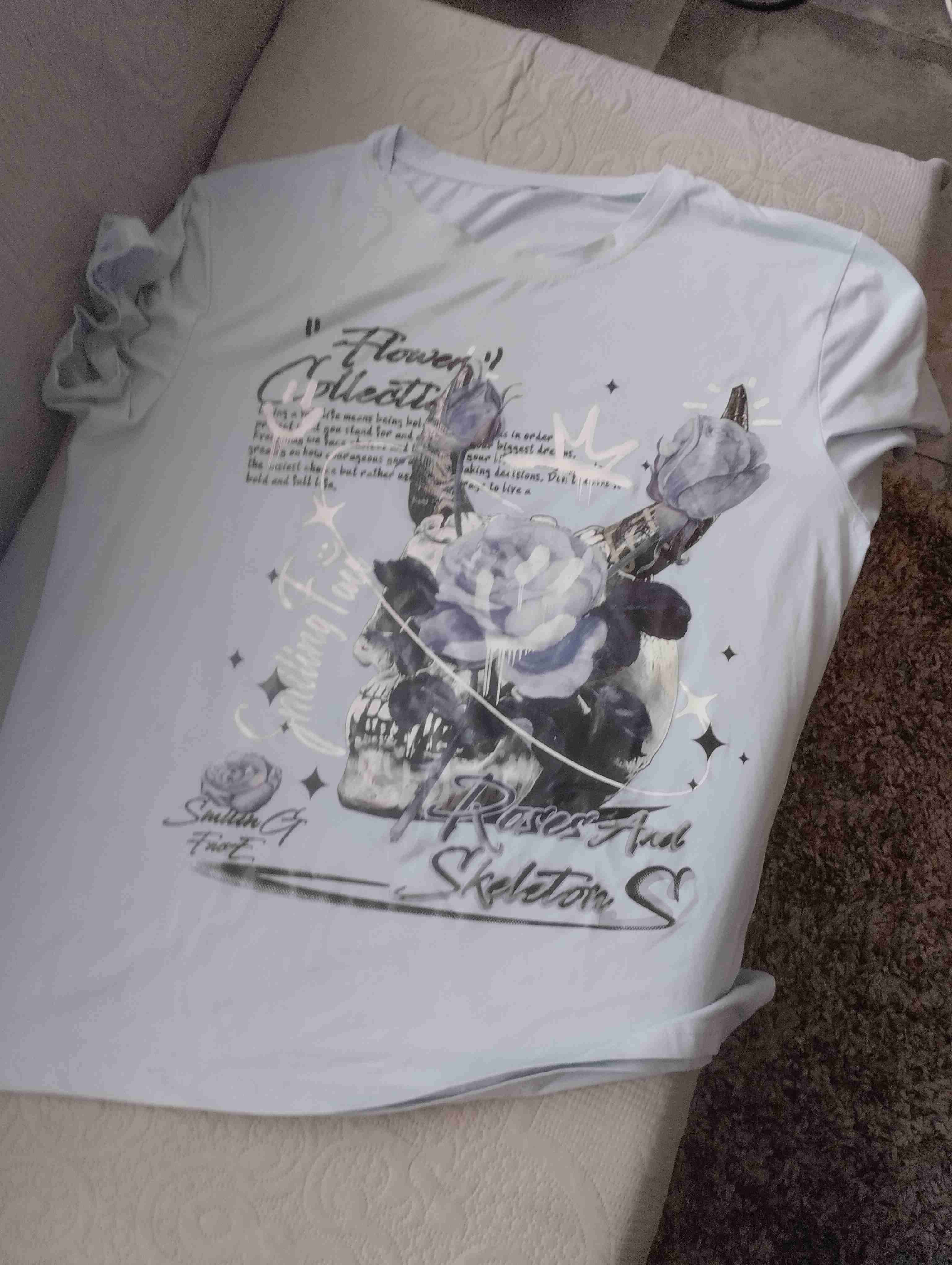 Polera de color celeste con un estampado de flores y calavera. En buen estado general, ideal para uso casual.
