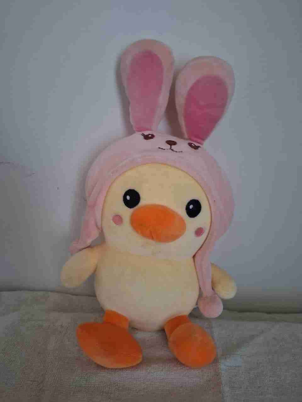 Peluche suave y tierno de pato con sombrero de conejo rosado. Ideal para decoración o como compañero de juegos.