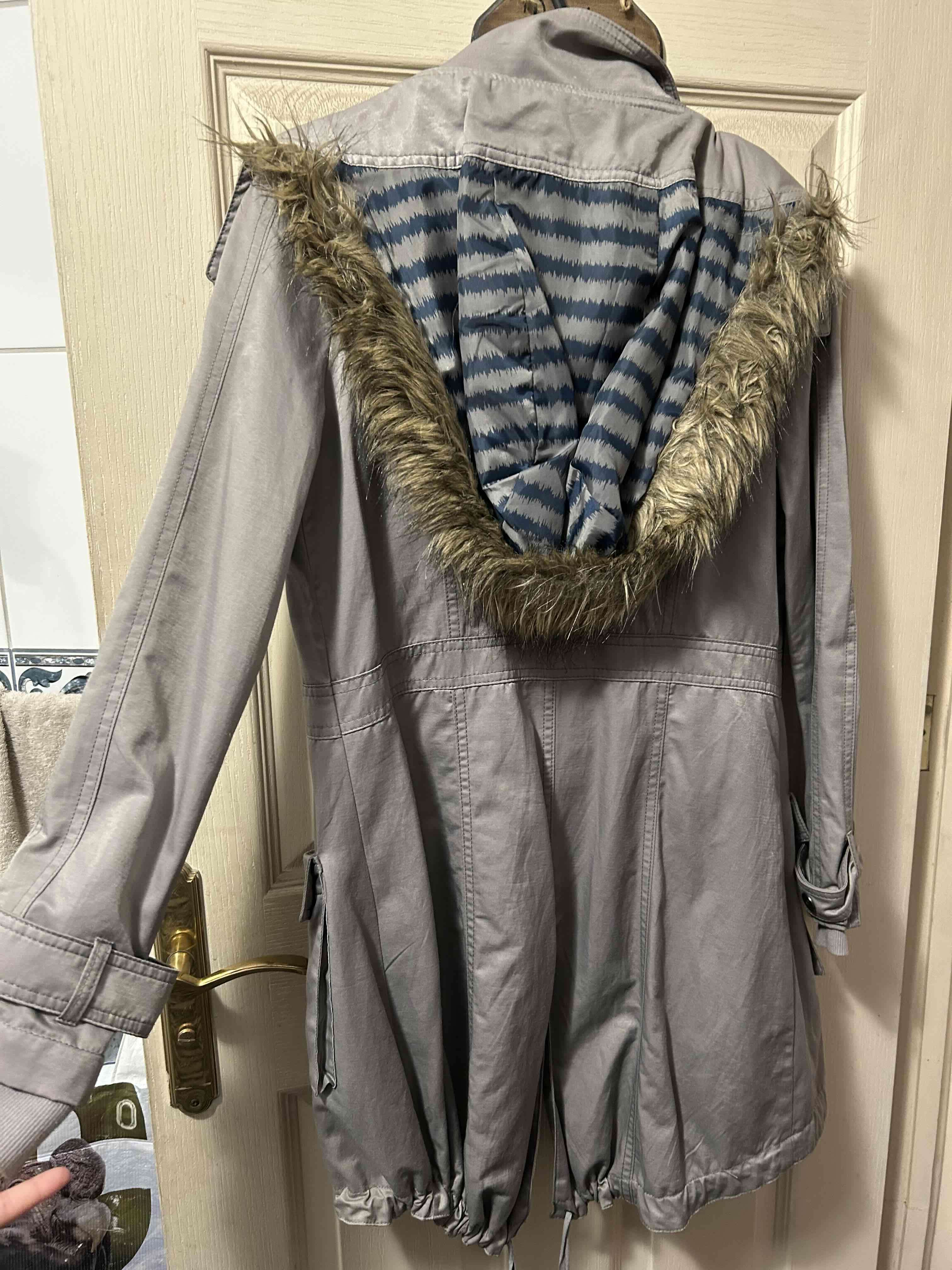 Parka color gris con capucha decorada con peluche. Ideal para climas fríos, con diseño práctico y moderno. En buen estado.